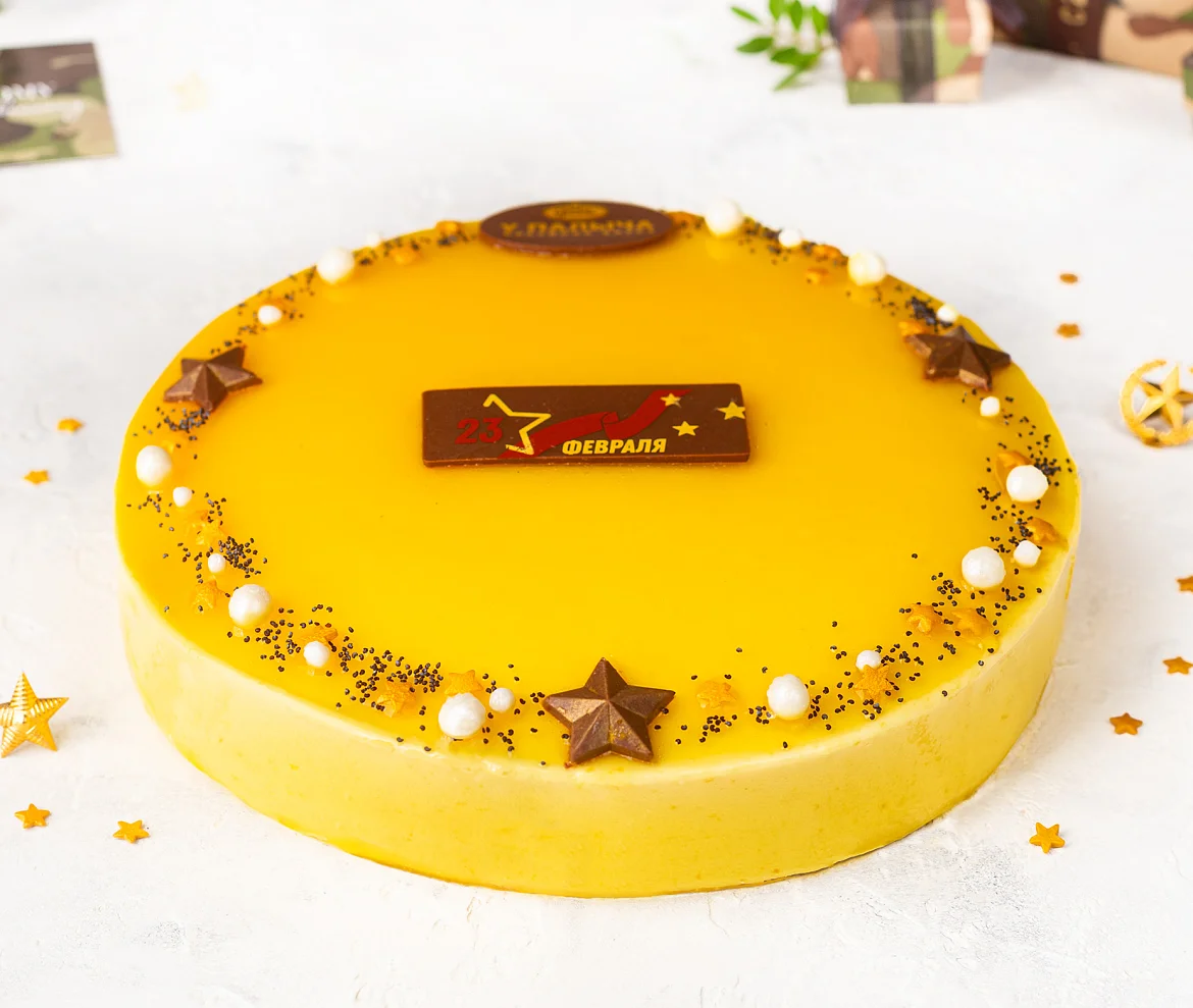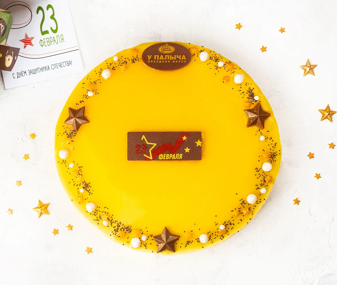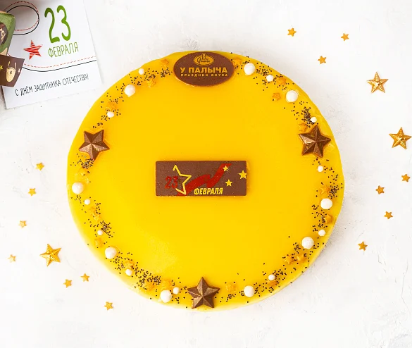 Восхитительный лёгкий торт с воздушным муссом, обилием тропических фруктов и тонкими коржами из натурального бисквита без эмульгаторов с добавлением превосходного чешского мака. Простой, понятный и чистый состав без консервантов, в котором нашли своё изумительное сочетание густые молочные сливки из отборного молока, творожный сыр без заменителей молочных жиров, пюре из плодов маракуйи и сочное тайское манго. К мужскому празднику 23 февраля торт украшен шоколадными звездочками и поздравительной открыткой из лучшего темного шоколада. ***Поздравительная надпись на торте может отличаться, но обязательно будет праздничной.