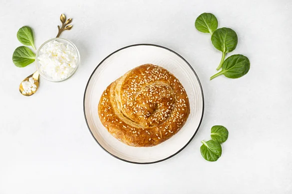 Улитка с творогом и шпинатом — нежная выпечка из слоёного теста. Начинка сочетает мягкий творог, шпинат и свежую петрушку с деликатной сырной ноткой Российского сыра и лёгким ароматом чеснока. Сверху улитка посыпана золотистым кунжутом, придающим аппетитный хруст и завершённость вкусу.