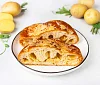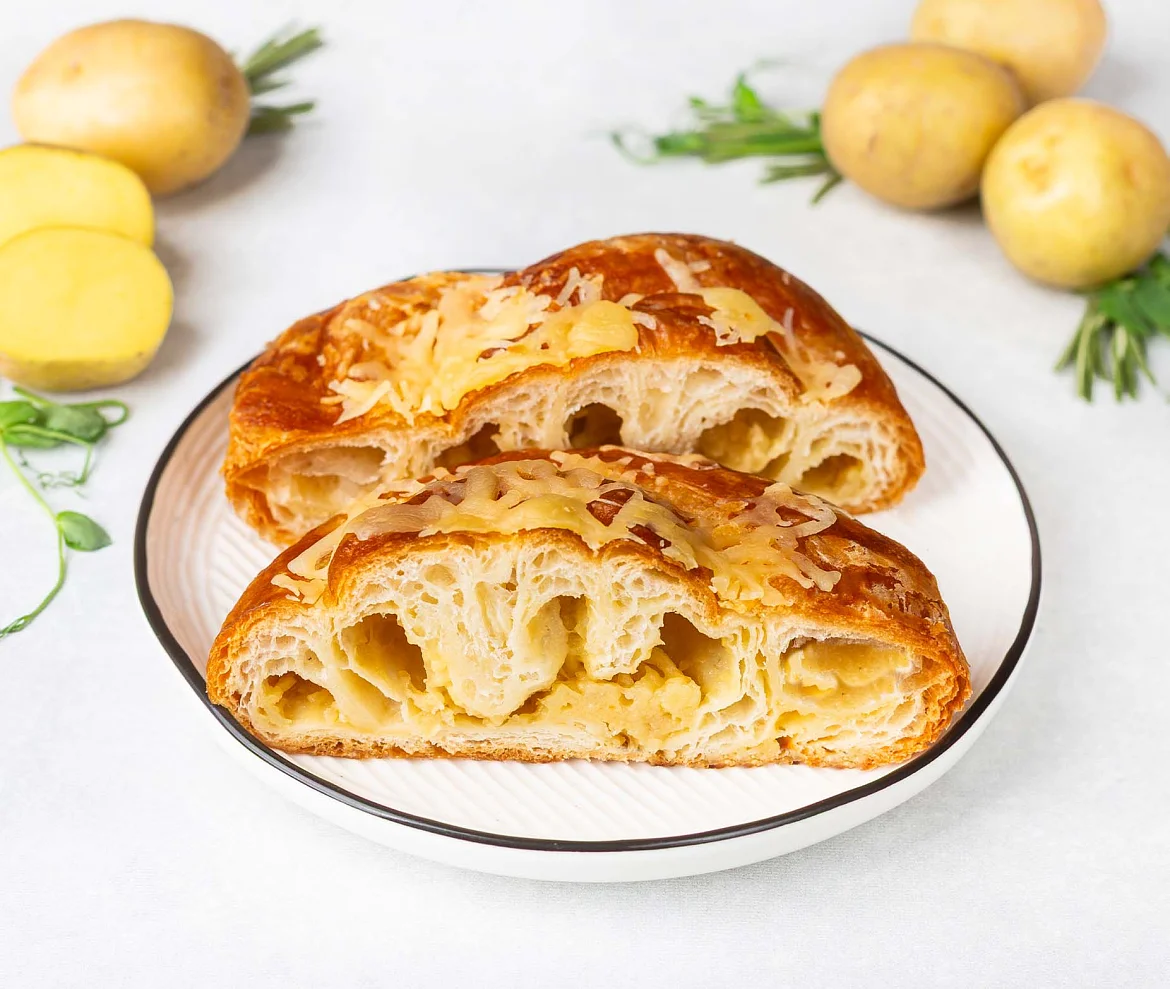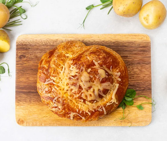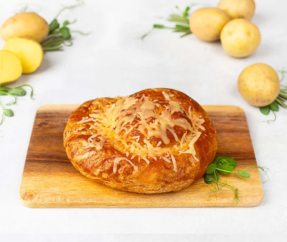 Улитка с картофелем — ароматная выпечка из слоёного теста. Начинка сочетает нежный картофель и обжаренный репчатый лук с мягким вкусом Российского сыра. Сверху улитка украшена тёртым пармезаном, который при запекании превращается в золотистую корочку с аппетитным сырным ароматом.