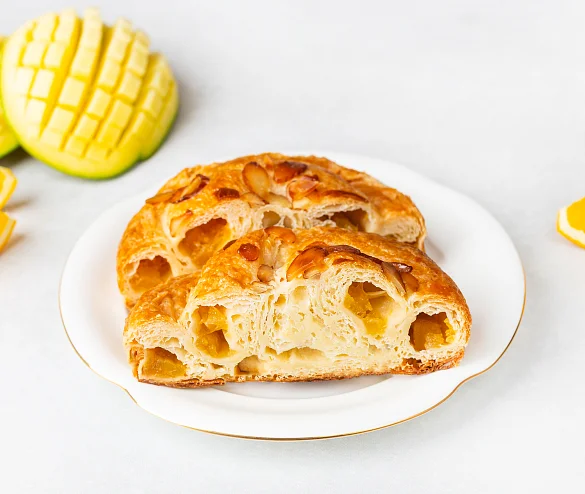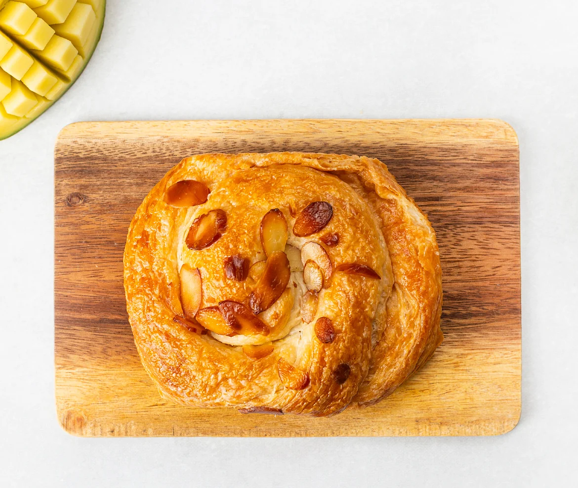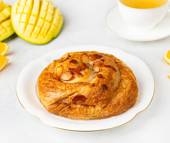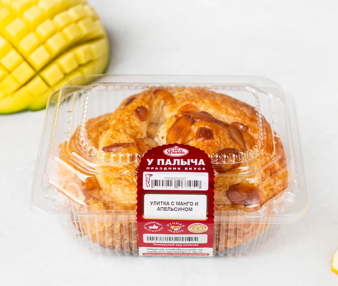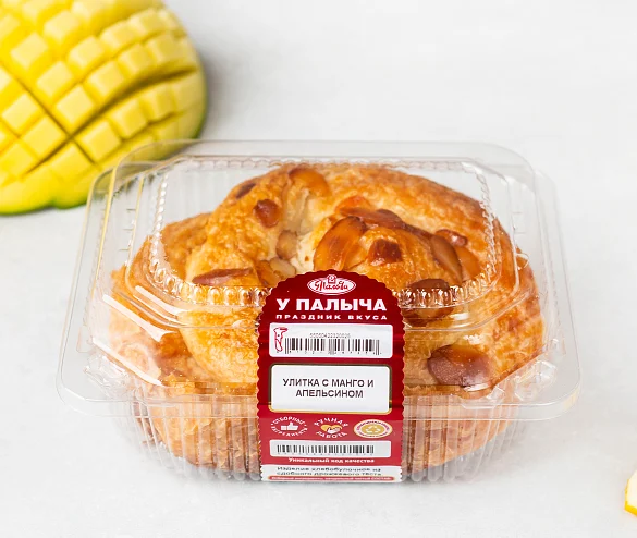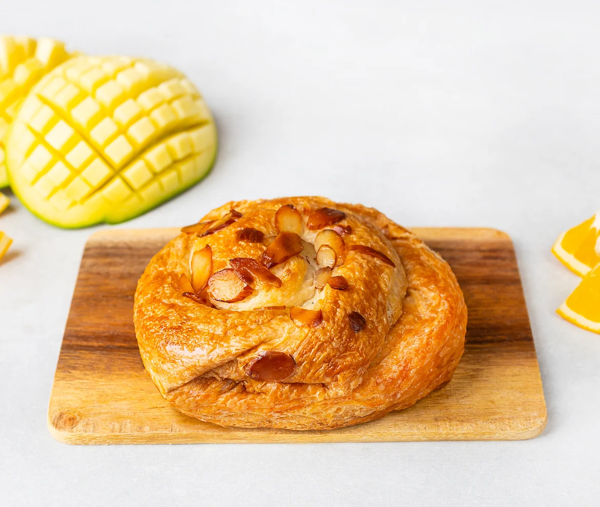 Улитка с манго и апельсинами — слоёное тесто с яркой тропической начинкой. Сочные кусочки манго и свежий апельсин дарят десерту насыщенный фруктовый вкус с лёгкой кислинкой и солнечной свежестью. Нежная сладость сахарной помадки и изящная посыпка миндалём создают гармоничное завершение этой утончённой выпечки.
