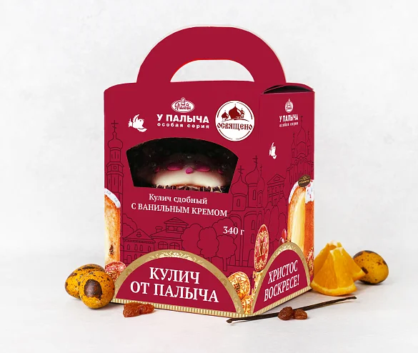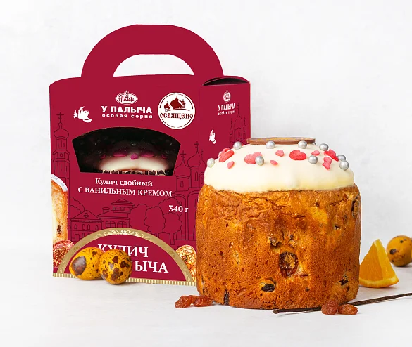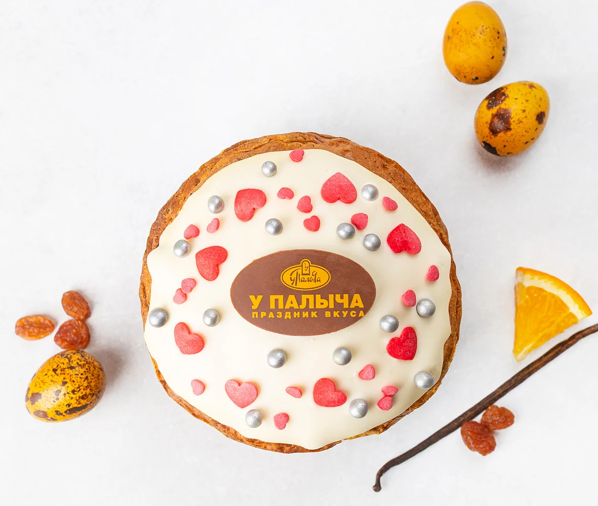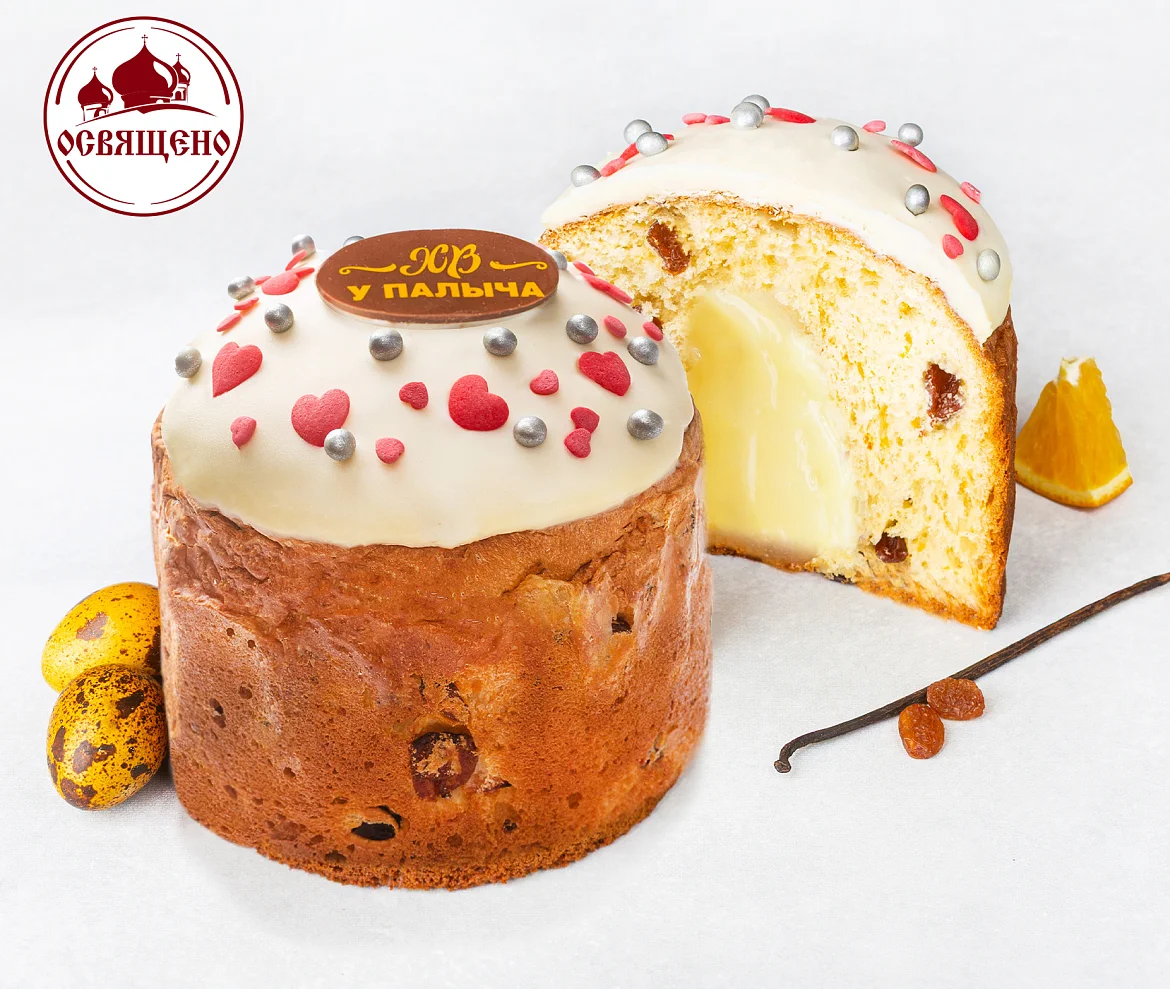 С заботой о вас вся пасхальная выпечка уже освящена. Воздушный мякиш золотистого цвета буквально тает рту а внутри ждёт нежная, бархатистая ванильная начинка - лёгкая, как облако, с натуральным ароматом стручковой ванили. Крупный сочный изюм и свежие апельсины добавляют яркости. Сверху легендарная густая белоснежная помадка от Палыча, яркая сладкая посыпка и шоколадная медалька с традиционным пасхальным приветствием.
