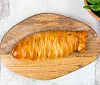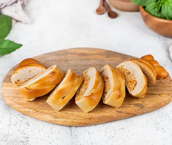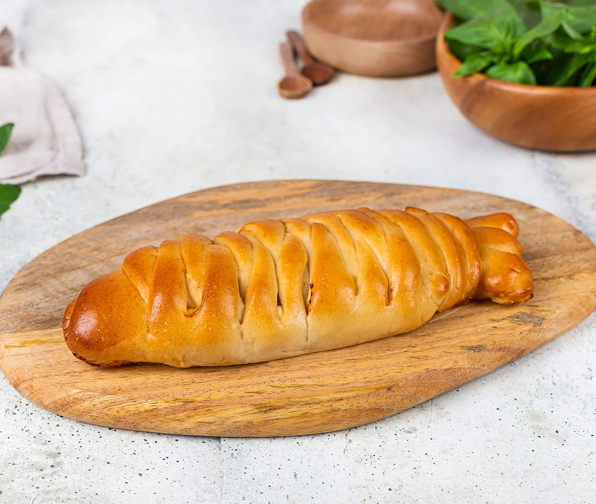 Исконно русский пирожок в виде плетеной из сдобного дрожжевого теста рыбки и с начинкой из рыбки — сочной горбуши, с добавлением свежего лучка, моркови и натурального Домашнего сыра.