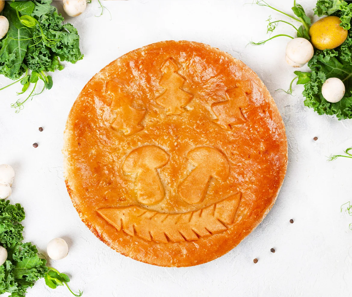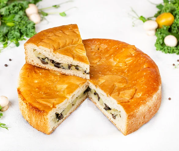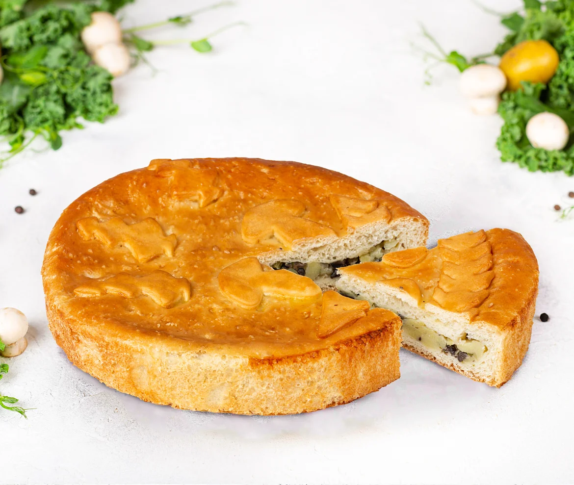 Классический домашний вегетарианский пирог с картофелем и шампиньонами, украшенный грибами. Тесто для этого пирога готовится вручную по постному рецепту, именно поэтому оно получается таким вкусным и нежным. Для равномерного пропекания пирога мы используем специальные режимы выпечки. Получается вкусно и по-домашнему!