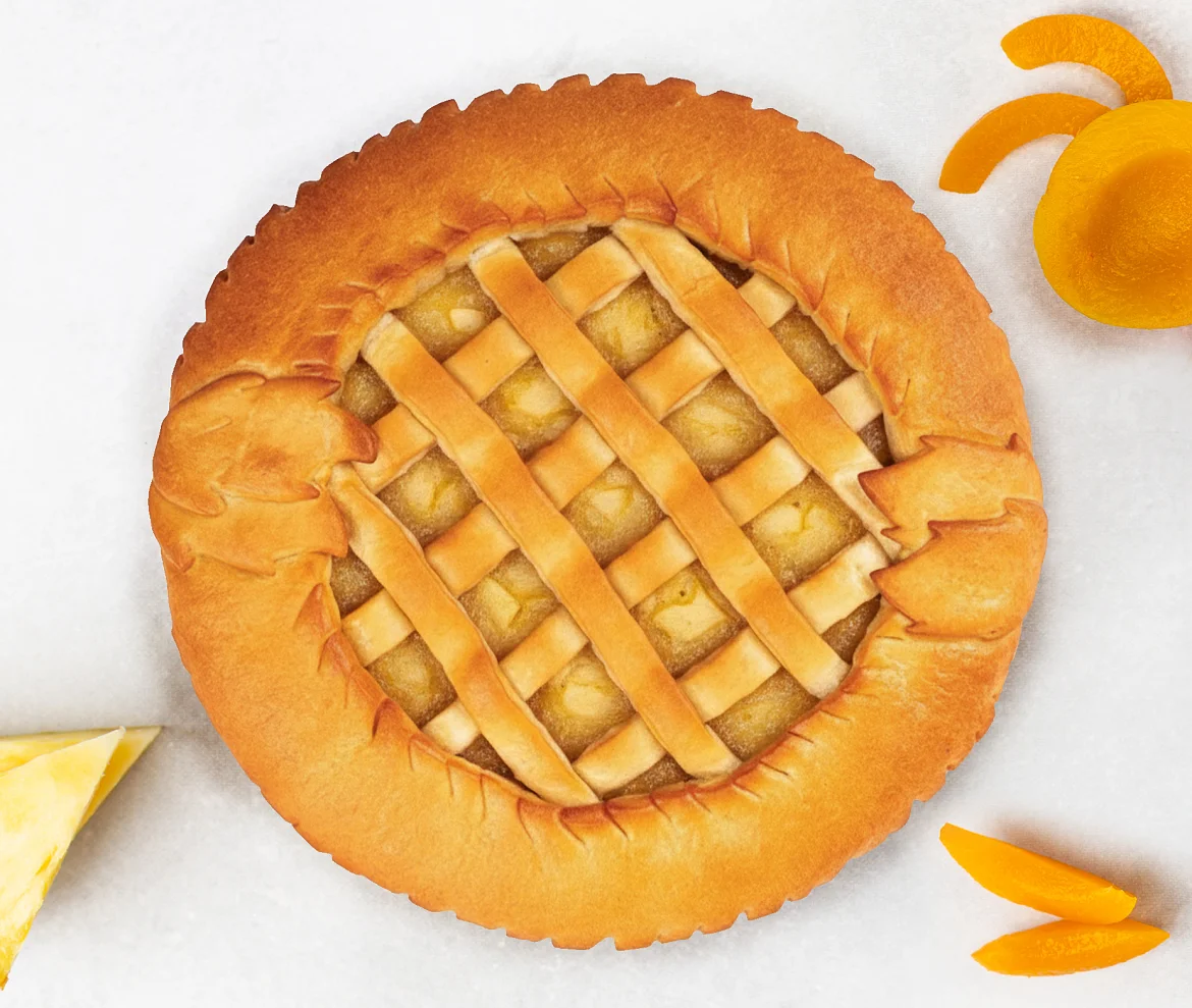 Изысканный постный пирог ручной работы с ароматной начинкой из ананаса, персиков и абрикосов.