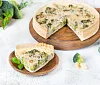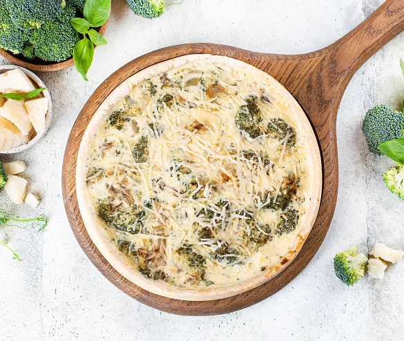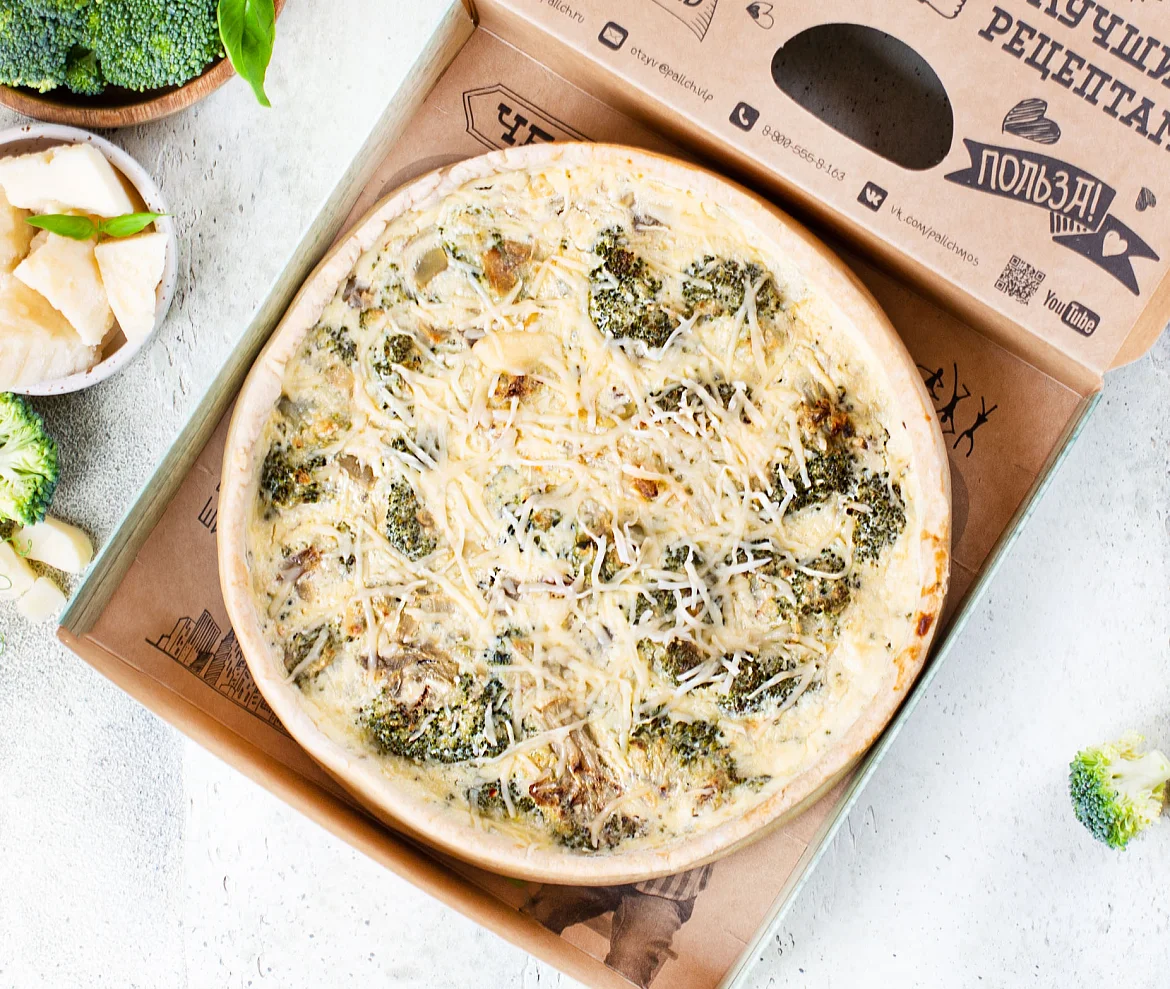 Начинка: капуста брокколи с/м (28%), сметана (сливки, закваска), яйцо куриное пищевое, перец сладкий маринованный (перец сладкий, вода, сахар, уксус столовый, соль, смесь пряностей и специй), лук репчатый свежий, сыр Домашний (творог, вода очищенная, масло сливочное, молочный белок, сухое обезжиренное молоко, соль, регуляторы кислотности: цитрат натрия, лимонная кислота), сыр Пармезан (молоко цельное, молоко обезжиренное, соль, заквасочные термофильные культуры микробного происхождения, уплотнитель хлорид кальция), соль; Тесто: мука пшеничная хлебопекарная в/с, вода очищенная, масло подсолнечное рафинированное дезодорированное, сахар, крахмал картофельный, соль, дрожжи хлебопекарные сухие. Произведено на предприятии, на котором также выпускаются продукты, содержащие арахис, горчицу, кунжут, моллюски, орехи, рыбу, сельдерей, сою.