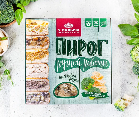 Французский открытый пирог «Киш Лорен» из дрожжевого теста с большим количеством овощей. В основе рецепта — правильно сформованная "корзинка", в которую укладывается начинка из брокколи, сыра, яиц. Свежесть обеспечивается за счёт уникальной технологии упаковки, позволяющий сохранить полезные свойства и отменные вкусовые качества продукта на протяжении всего срока годности.