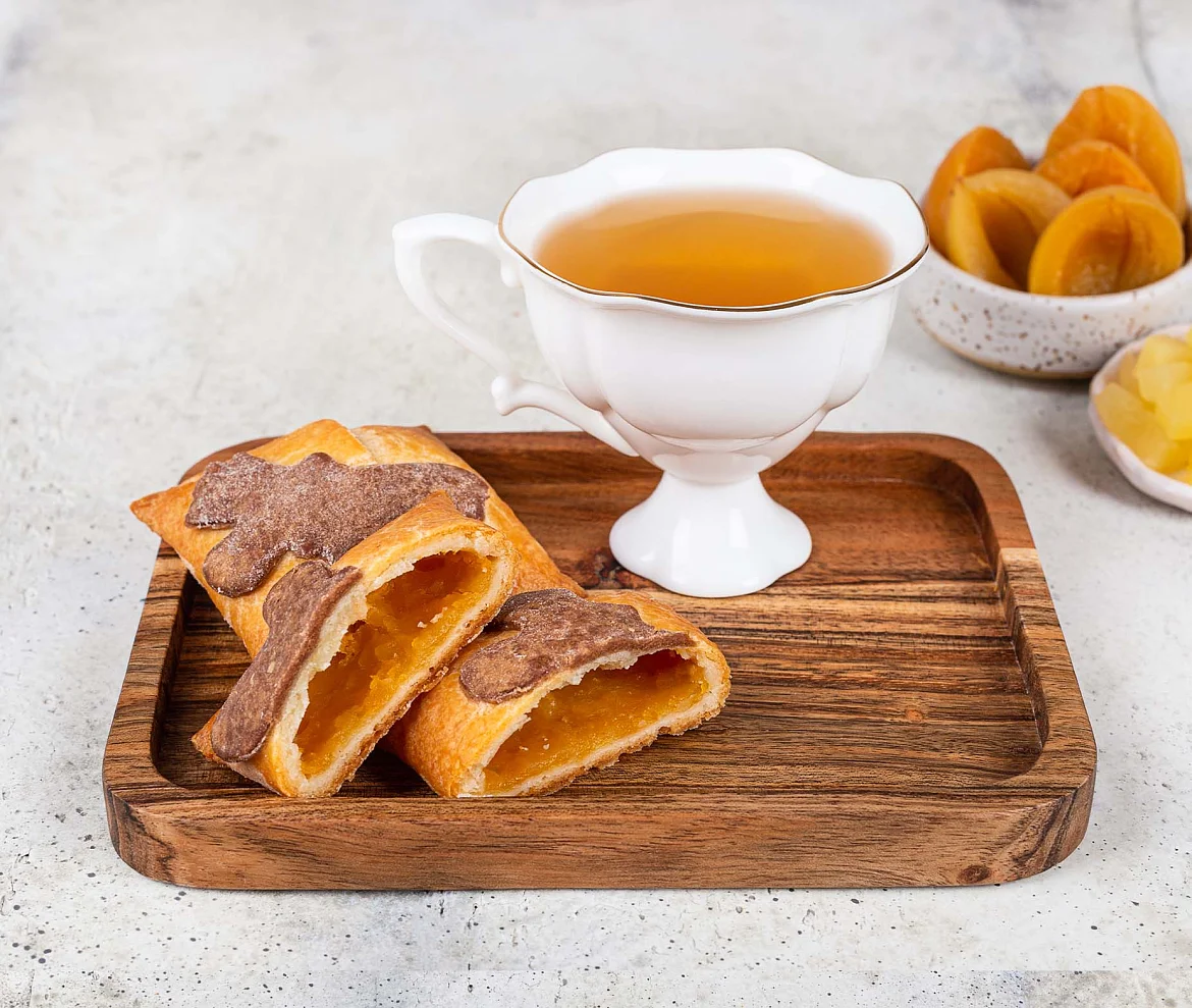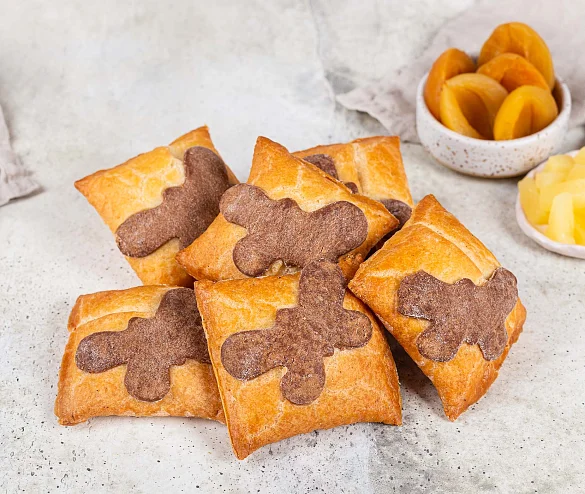 Изящные конвертики изготавливаются из тонко раскатанного нежного песочного теста на твороге с начинкой из консервированных персика и ананаса, с добавлением абрикосовой начинки.Сверху пирожное украшается бабочкой из теста на твороге с добавлением какао, выпекается и посыпается нетающей сахарной пудрой.