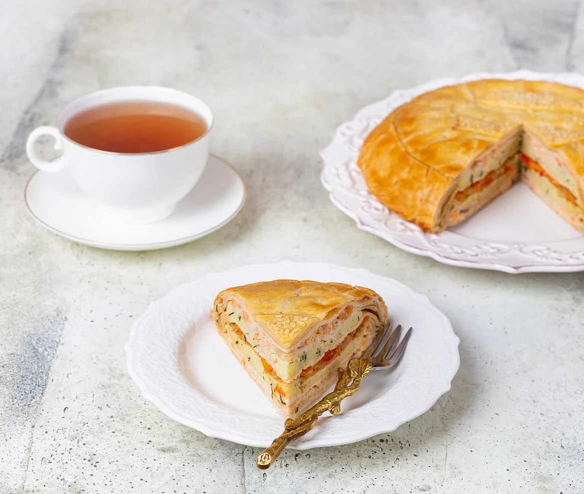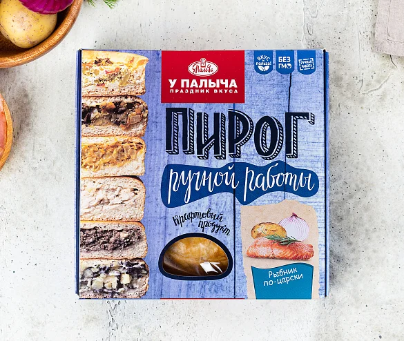 ПИРОГ, ДОСТОЙНЫЙ ЦАРЕЙ! БОГАТЫЙ ВКУС И РОСКОШНЫЙ ВНЕШНИЙ ВИД ДЛЯ ТОРЖЕСТВЕННЫХ СЛУЧАЕВ! Умение готовить такой пирог считалось на Руси вершиной кулинарного мастерства. Этот роскошный пирог подавали только в особо торжественных случаях и к царскому столу! Пирог по-царски — очень сложное блюдо: требует времени, терпения и высокого профессионализма. Наши мастера-пекари вкладывают в пирог душу, чтобы оправдать Ваши ожидания! Начинка в этих пирогах – главный герой! Она составляет больше 60% от веса всего пирога и состоит из 5 слоев, уложенных последовательно и разделенных между собой тонкими нежными блинчиками для предотвращения смешивания. При разрезе пирога получаются аккуратные и аппетитные кусочки – каждый слой начинки можно рассмотреть. Нежное слоеное тесто и начинка состоят только из натуральных продуктов, без искусственных ароматизаторов, добавок, заменителей. Что указано на упаковке – то и внутри изделия! Радужная форель премиального размера, молодой картофель, болгарский перец, морковь и ароматный жареный лук - насыщенный традиционный вкус доставит истинное наслаждение!