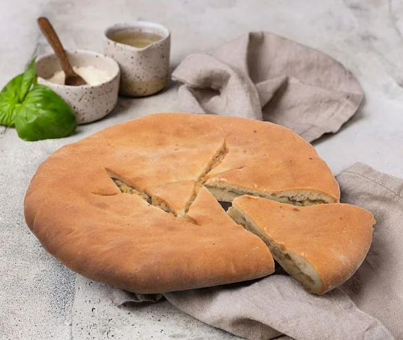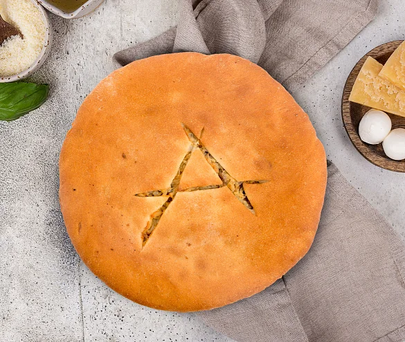 Вкуснейший осетинский пирог по фирменному рецепту нашего шеф-повара. Чтобы пирог получился особенно вкусным и полезным, при его приготовлении не используются заменители молочных жиров – никаких маргаринов и сырных продуктов. Тесто замешано на цельном молоке без добавления яиц. А в начинке настоящий знаменитый грузинский сыр сулугуни, к которому отлично подходят свежие грибы и лучок, поджаренные на быстром огне, и молодой отварной картофель. Очень важно правильно сформировать и затем раскатать такой пирог. Это 100% ручная работа пекаря - мастера своего дела. Пирог после выпечки смазывается сливочным маслом – так он становится нежнее и ароматнее. Мы упаковываем пироги в дополнительную «умную» пленку, позволяющую сохранить отменные вкусовые качества и полезные свойства продукта без добавления консервантов.