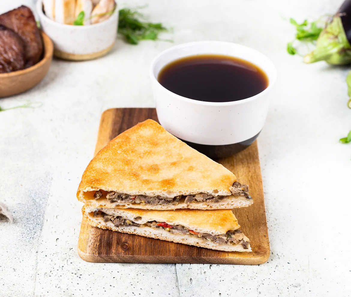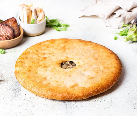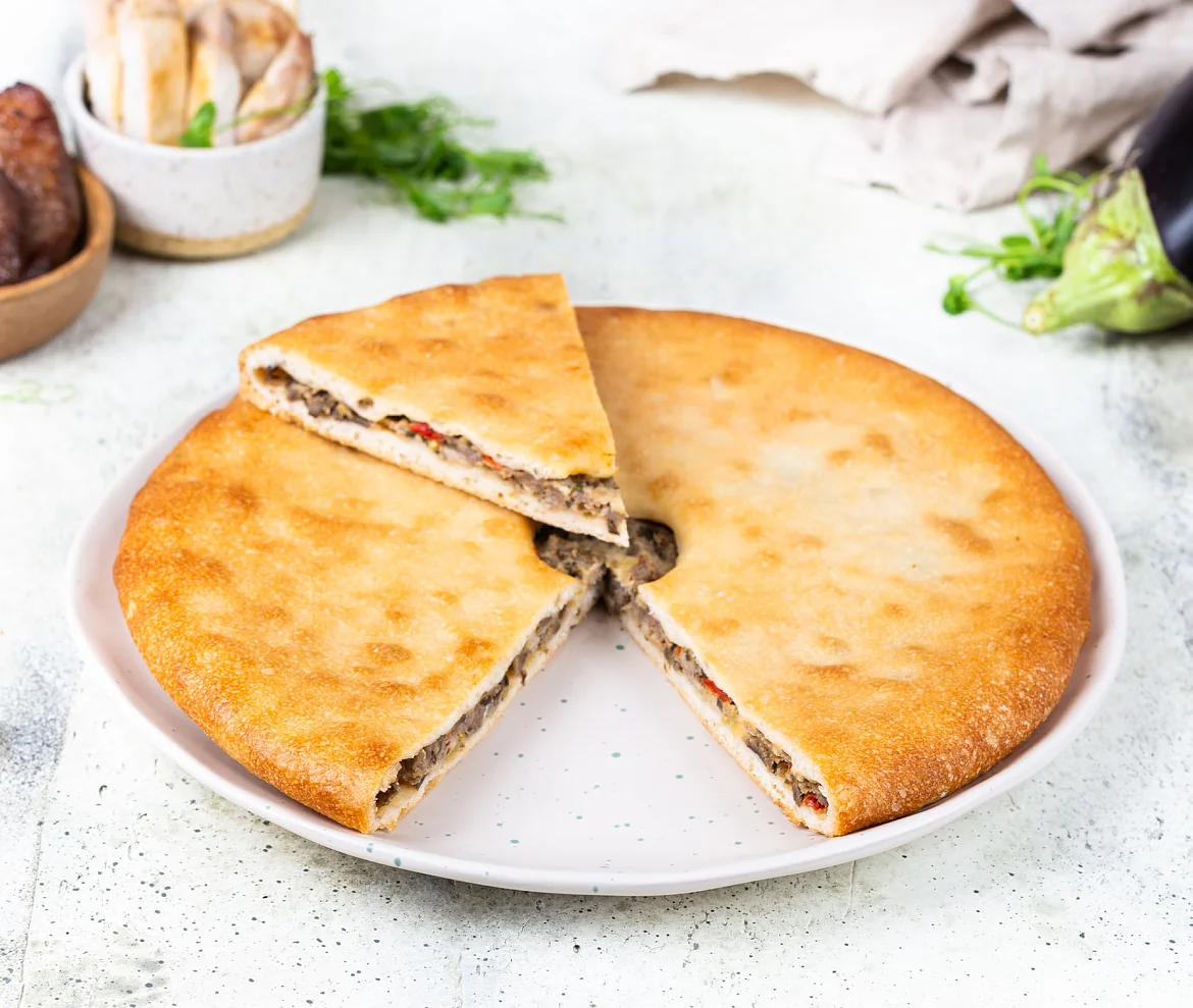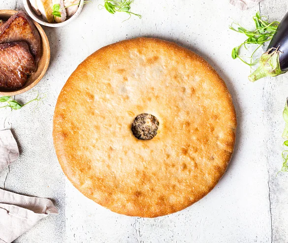 Вкуснейший осетинский пирог по фирменному рецепту нашего шеф-повара. В наших осетинских пирогах мы используем особенное тончайшее сдобное тесто без яйца. В начинку мы добавляем свежие баклажаны и два вида мяса. Очень важно правильно сформировать и затем раскатать такой пирог. Это 100% ручная работа. Свежесть обеспечивается за счёт уникальной технологии упаковки, позволяющий сохранить полезные свойства и отменные вкусовые качества продукта на протяжении всего срока годности.