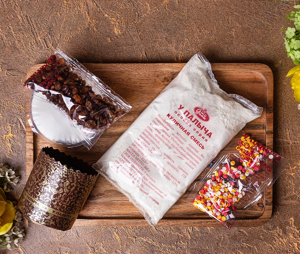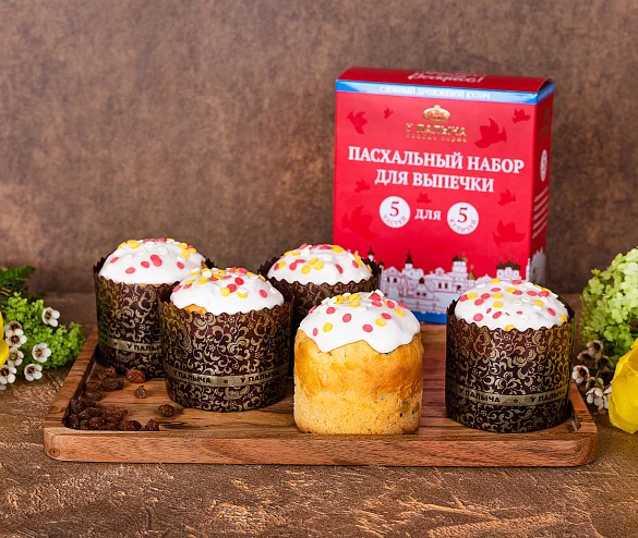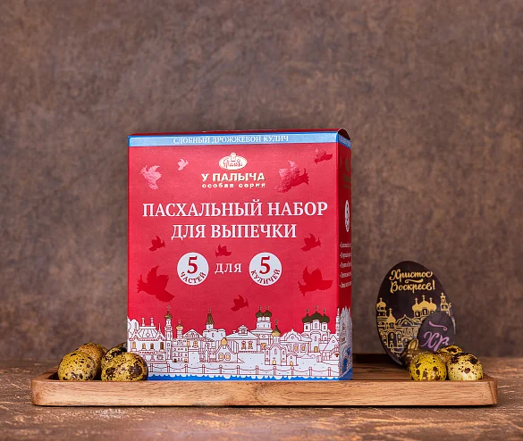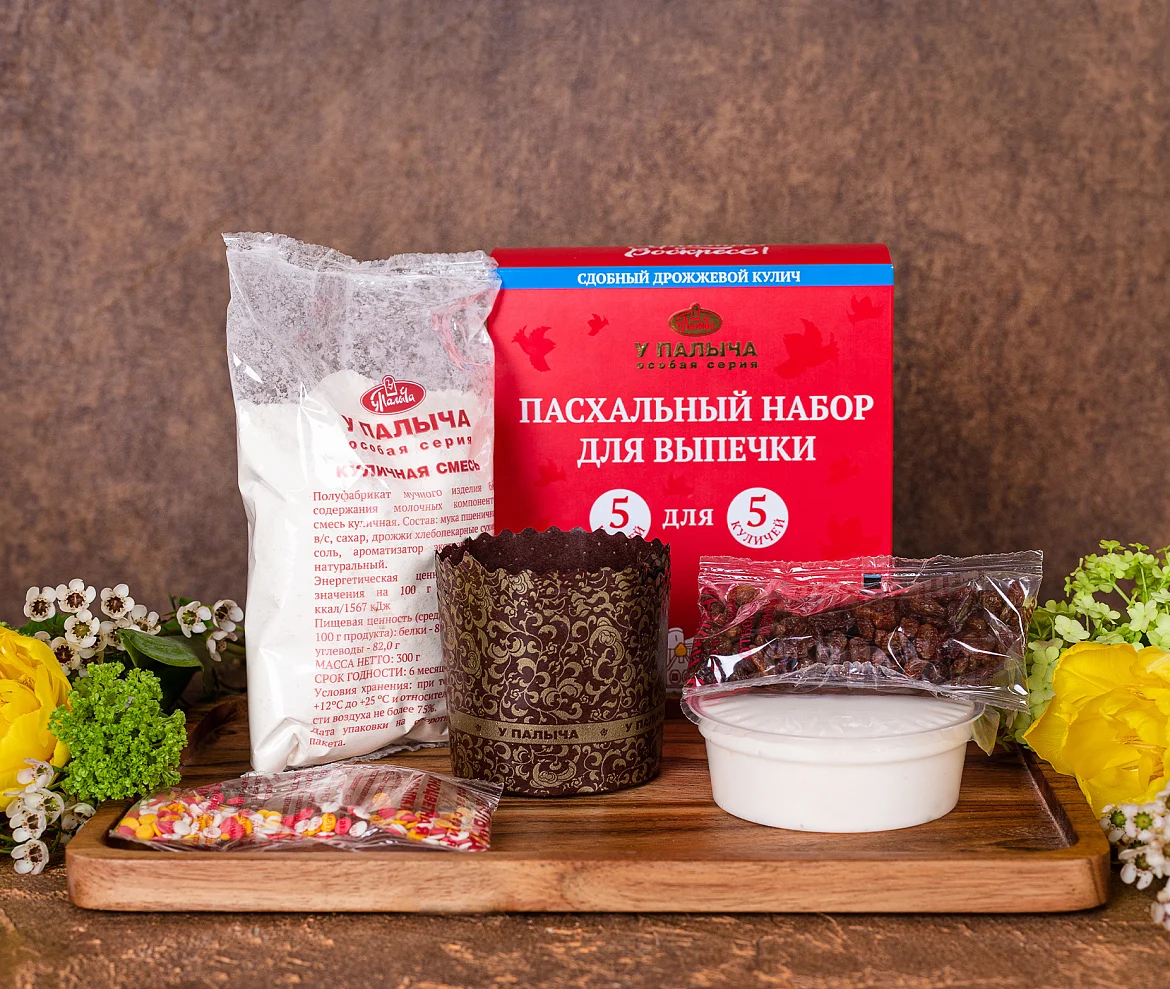 Современный, надежный и очень удобный способ подготовиться к празднику Светлой Пасхи быстро и легко. 5 простых шагов — и превосходные сдобные дрожжевые куличики готовы! Готовить легко и весело! 100% натуральный классический состав, безопасные ингредиенты и лучшие советы в поэтапном приготовлении традиционного лакомства. Набор состоит из 5 частей: • куличная смесь, • отборный изюм, • разноцветная посыпка, • сахарная помадка • 5 бумажных формочек. Нужно добавить только: Сливочное масло, молоко, сметану, яйца. Благодаря гармоничному сочетанию всех частей набора, русским обычаям и богатому опыту бренд-шефа У Палыча, каждый набор подарит 5 настоящих пышных красавцев-куличей — главного символа Пасхи. Лакомства хватит на всю семью! Вес набора: 460 г. Вес 1 готового кулича: 120 г +/-10г