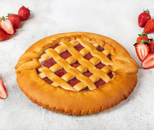 Начинка: сахар, клубника с/м (39%), вода очищенная, крахмал кукурузный, загуститель пектины; Тесто: мука пшеничная хлебопекарная в/с, вода очищенная, масло подсолнечное рафинированное дезодорированное, сахар, крахмал картофельный, соль, дрожжи хлебопекарные сухие, краситель натуральный бета-каротин, ароматизатор экстракт ванили натуральный. Произведено на предприятии, на котором также выпускаются продукты, содержащие арахис, горчицу, кунжут, моллюски, молоко, орехи, рыбу, сельдерей, сою, яйца.
