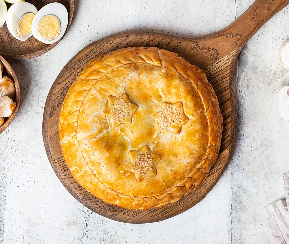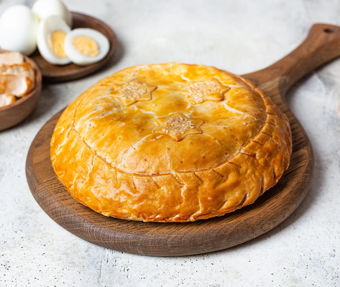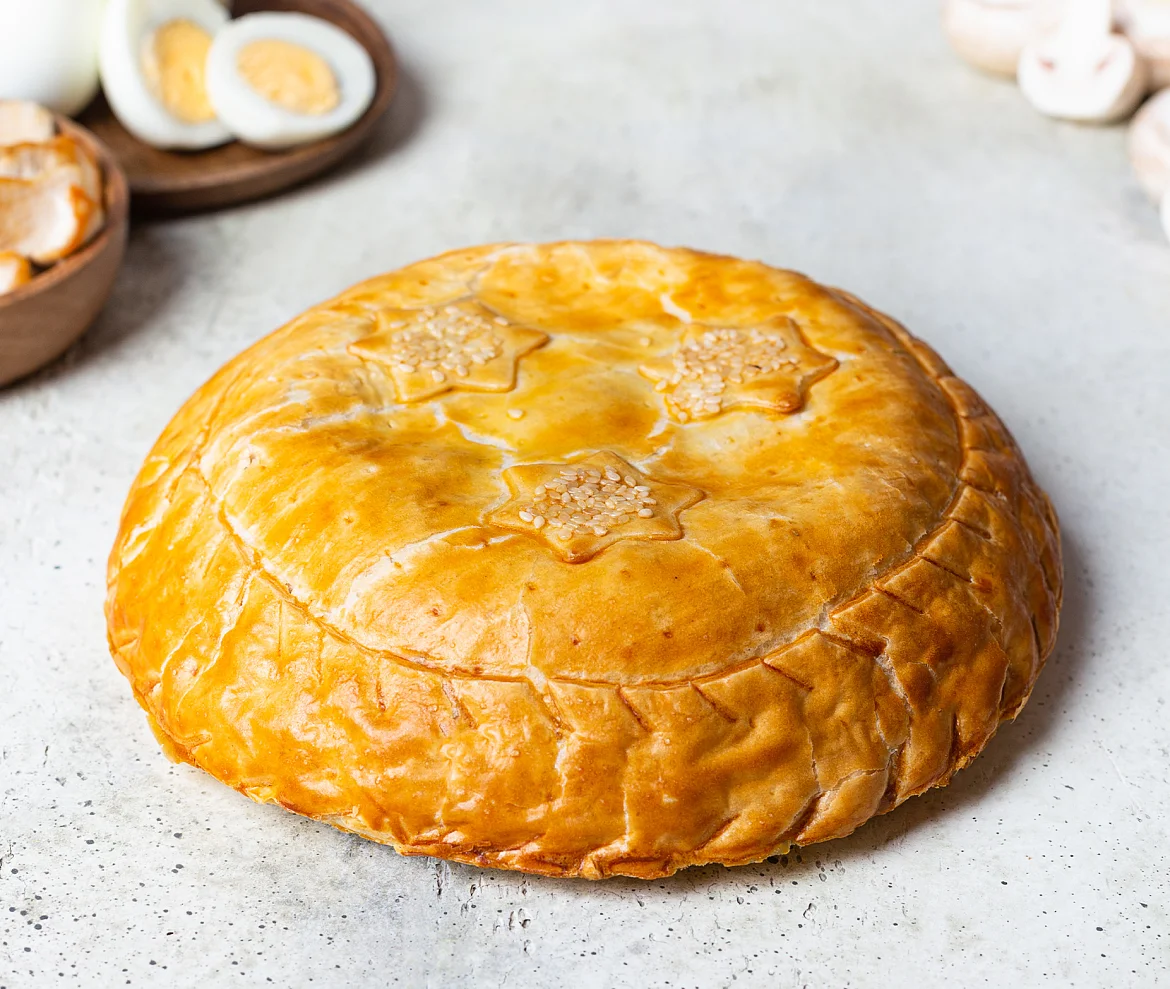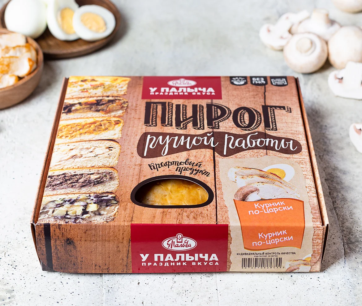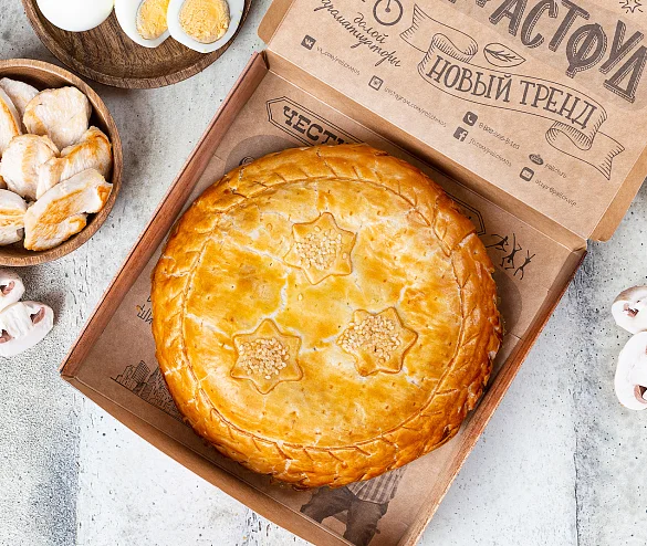 ПИРОГ, ДОСТОЙНЫЙ ЦАРЕЙ! БОГАТЫЙ ВКУС И РОСКОШНЫЙ ВНЕШНИЙ ВИД ДЛЯ ТОРЖЕСТВЕННЫХ СЛУЧАЕВ! Умение готовить такой пирог считалось на Руси вершиной кулинарного мастерства. Этот роскошный пирог подавали только в особо торжественных случаях и к царскому столу! Пирог по-царски — очень сложное блюдо: требует времени, терпения и высокого профессионализма. Наши мастера-пекари вкладывают в пирог душу, чтобы оправдать Ваши ожидания! Начинка в этих пирогах – главный герой! Она составляет больше 60% от веса всего пирога и состоит из 5 слоев, уложенных последовательно и разделенных между собой тонкими нежными блинчиками для предотвращения смешивания. При разрезе пирога получаются аккуратные и аппетитные кусочки – каждый слой начинки можно рассмотреть. Нежное слоеное тесто и начинка состоят только из натуральных продуктов, без искусственных ароматизаторов, добавок, заменителей. Что указано на упаковке – то и внутри изделия! Отборная курица, ароматные грибы и деревенские яйца – традиционное русское сочетание для наслаждения по особому поводу!