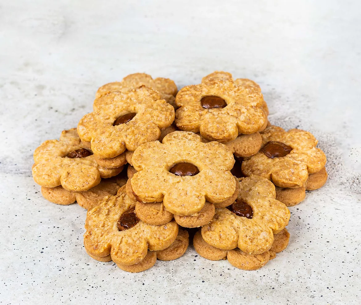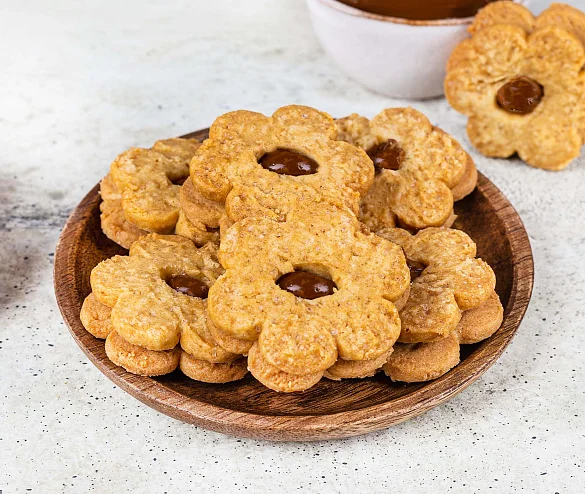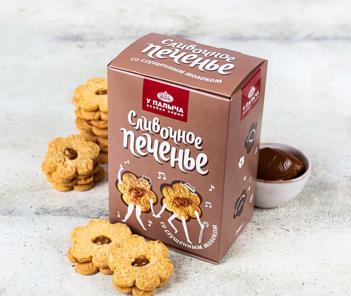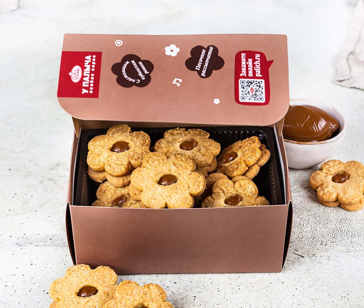 Нежное хрустящее печенье на сливочном масле и с тростниковым сахаром. Печенье двухслойное, одна половинка печенья имеет круглое отверстие, через которое видна начинка из варёного сгущённого молока. В структуре печенья видны кристаллики карамелизованного тростникового сахара, что придает печенью приятный карамельный привкус. Печенье формой в виде цветочка, с серединкой из начинки.