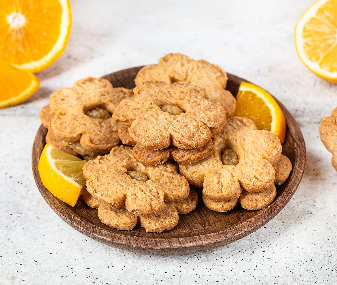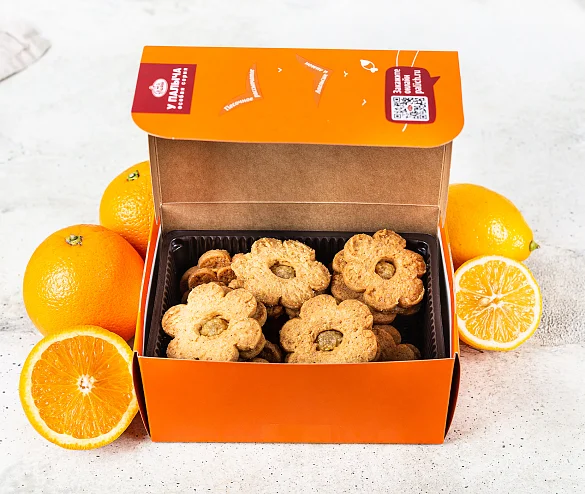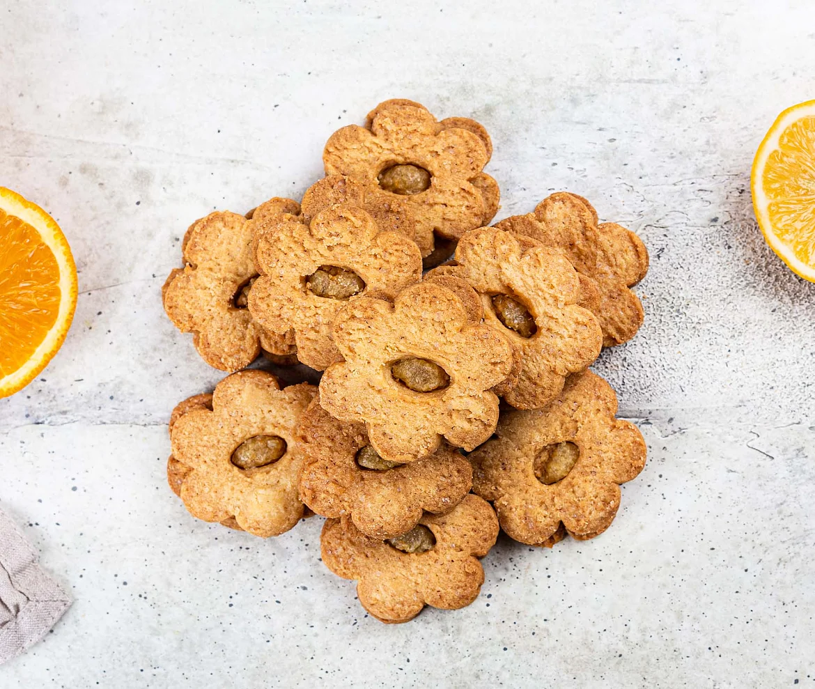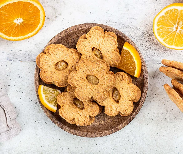 Нежное хрустящее печенье на сливочном масле и тростниковом сахаре. Печенье двухслойное, одна половинка печенья имеет круглое отверстие, через которое видна начинка из апельсина и лимона. Печенье формой в виде цветочка, с серединкой из начинки.
