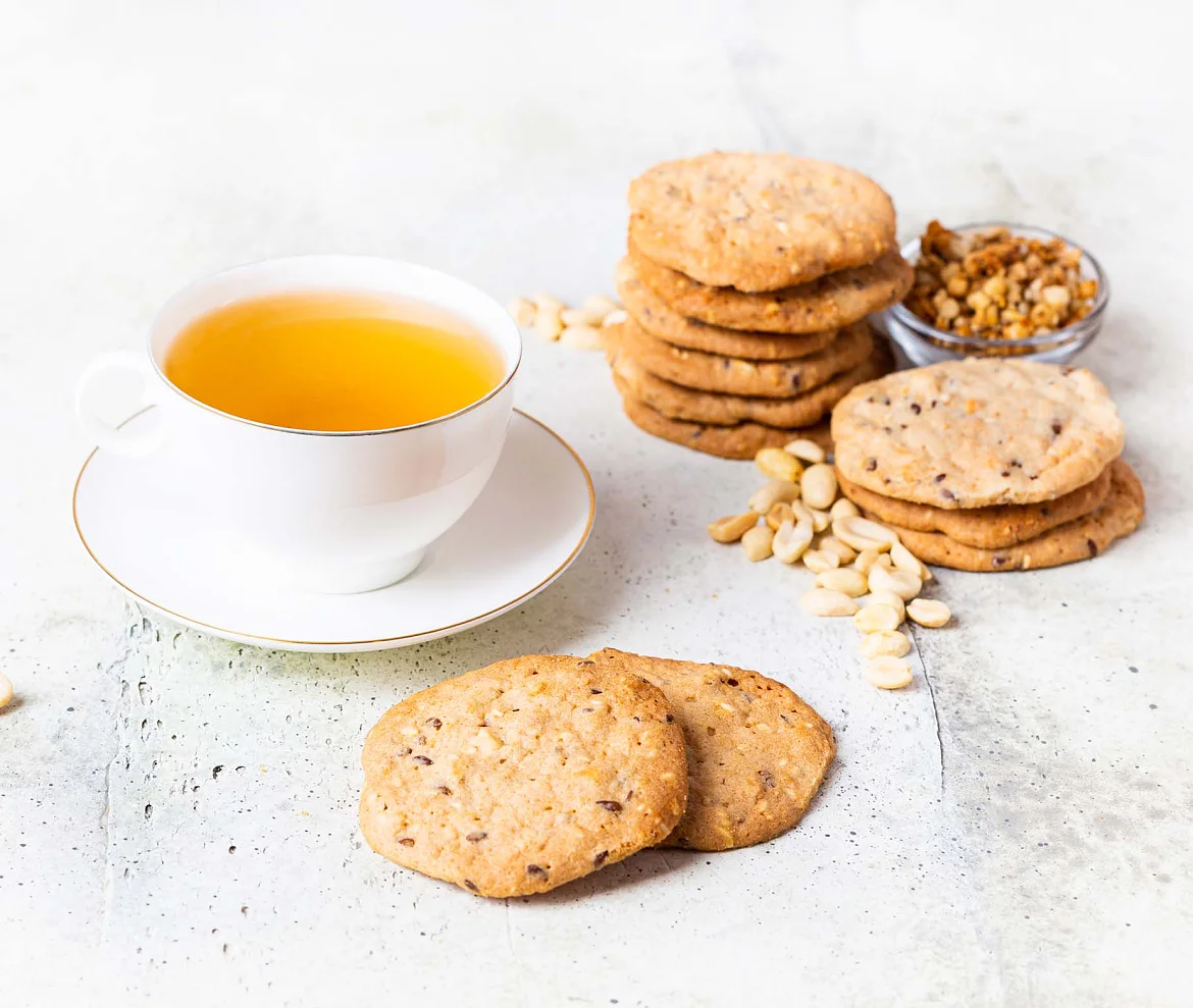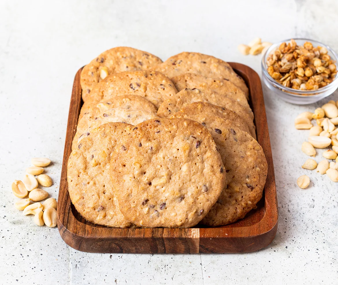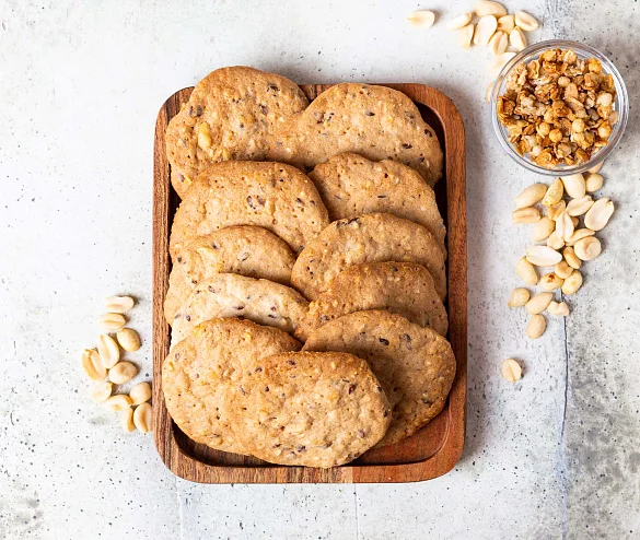 Ароматное хрустящее печенье с арахисом, ванилью и двумя видами муки: пшеничной и ржаной, последняя из которых выгодно подчеркивает вкус лакомства и оказывает положительное влияние на пищеварение. Восхитительную композицию дополняют кунжут, семена льна и овсяные хлопья — для аппетитной хрусткости и максимальной пользы.