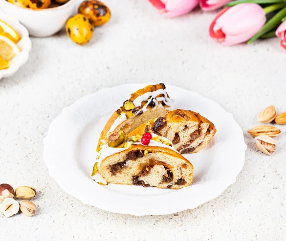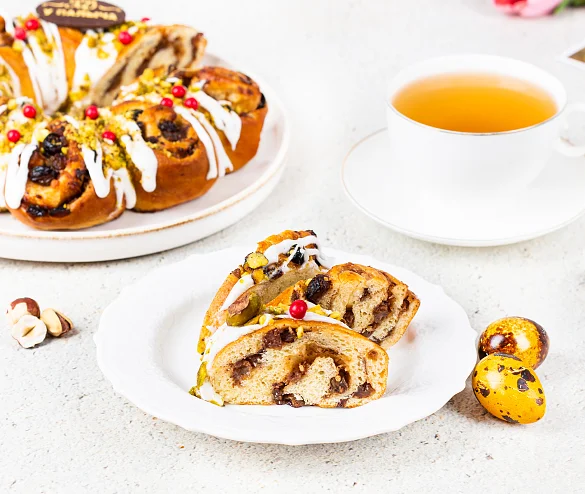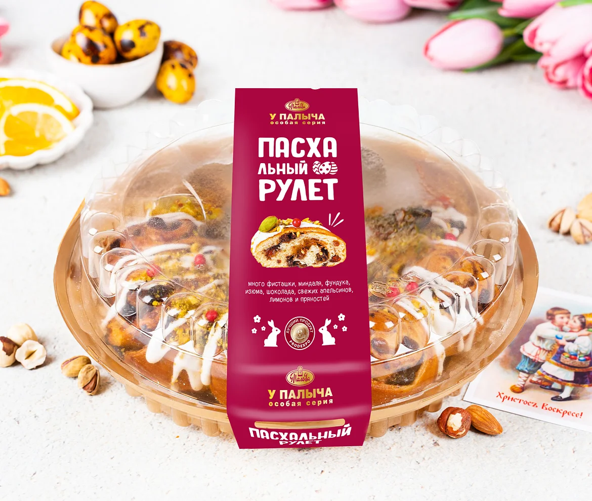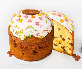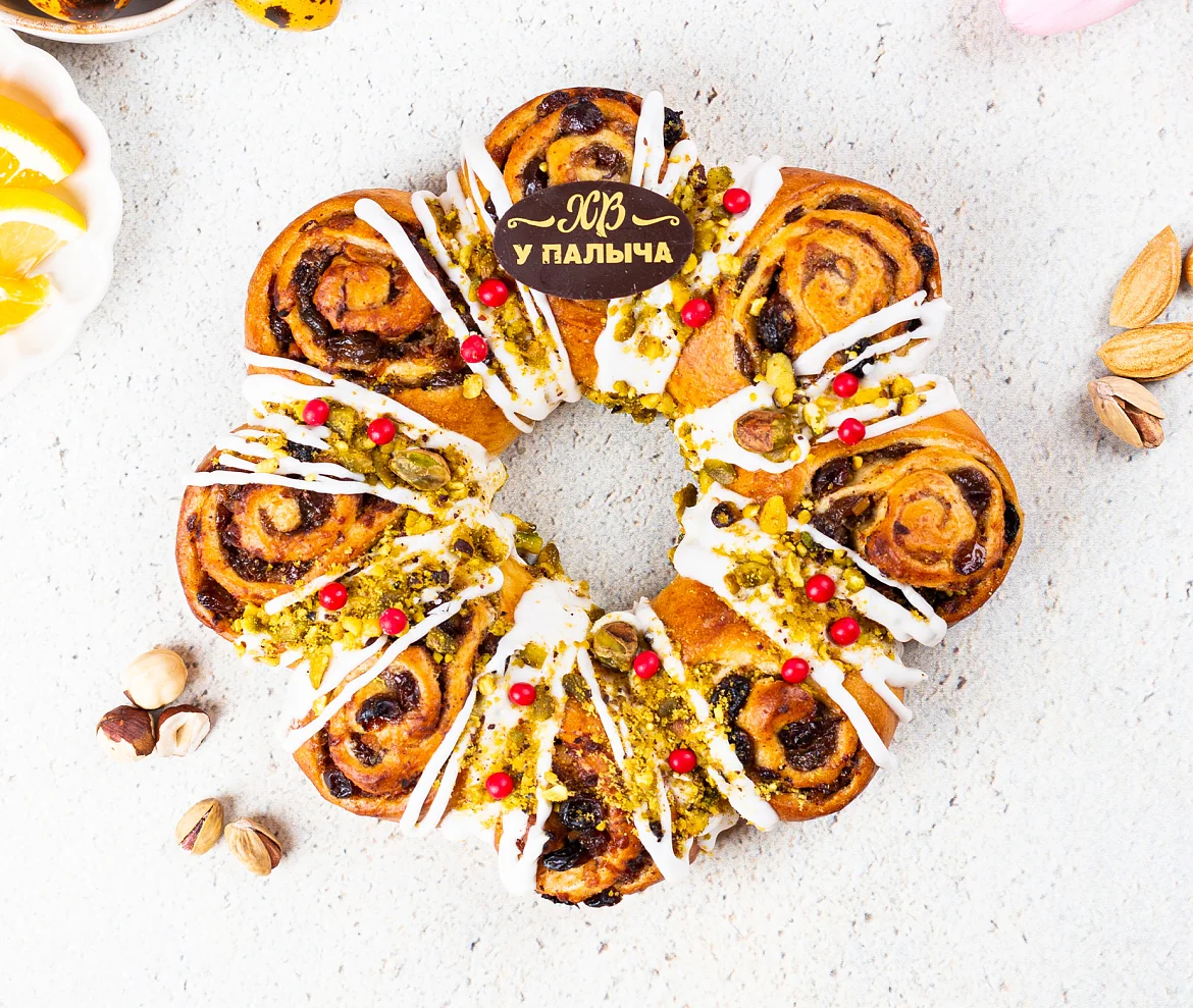 С заботой о вас вся пасхальная выпечка уже освящена. Потрясающе вкусный шедевр от шефа ТМ «У Палыча» специально к Светлому празднику! Роскошный витой цветок из нежного дрожжевого теста, с обилием миндаля и фундука, отборного изюма, свежих лимонов и апельсинов, изысканного темного шоколада, с мускатным орехом и корицей, украшен фисташкой и традиционной сахарной глазурью.
