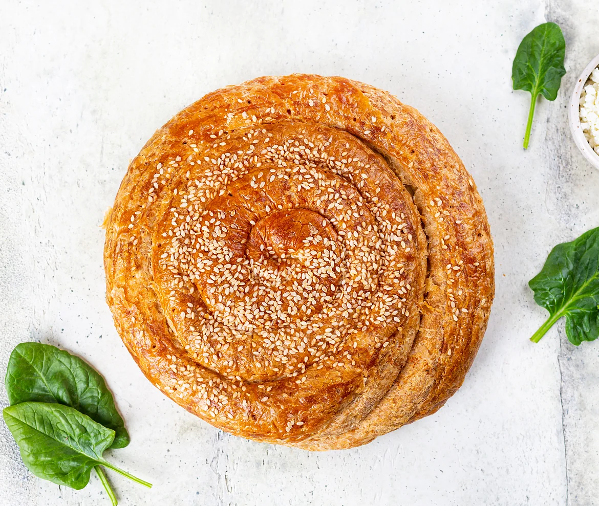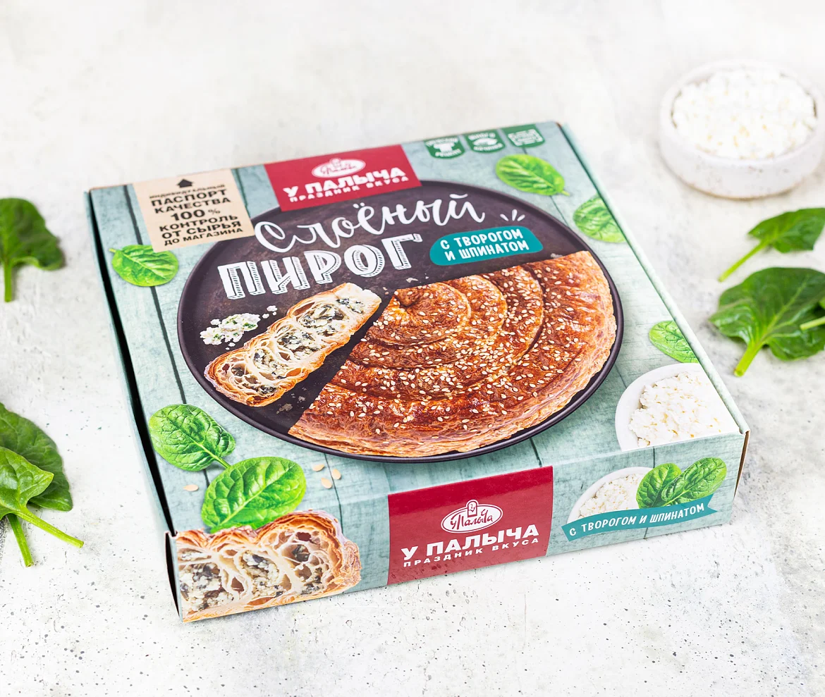 Традиционный греческий пирог из слоеного теста в форме большой улитки. Воздушное слоеное тесто из 256 слоев обладает особенно тонким вкусом и прекрасно сочетается с начинкой из настоящего творога, нежного творожного сыра и полезного шпината. Сверху пирог посыпан ароматным и полезным кунжутом. Благодаря оригинальной форме начинка равномерно распределана по пирогу. Слоеный пирог от Палыча - крафтовый пирог, изготовленный вручную, без улучшителей и заменителей.