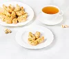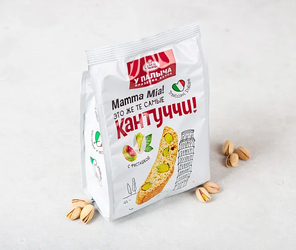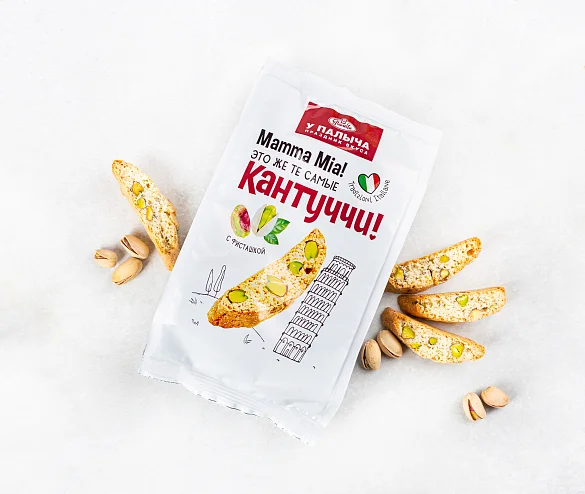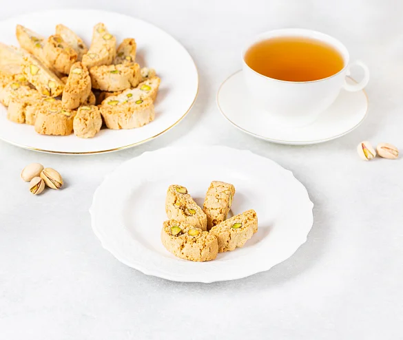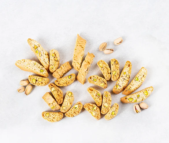 Традиционное итальянское печенье из сдобного теста с отборной фисташкой. Печенье сначала выпекается, а потом подсушивается, поэтому оно такое хрустящее и румяное. В составе премиальная бурбонская ваниль, ароматная цедра лимонов и много вкуснейшей иранской фисташки - идеальное лакомство для чаепития.