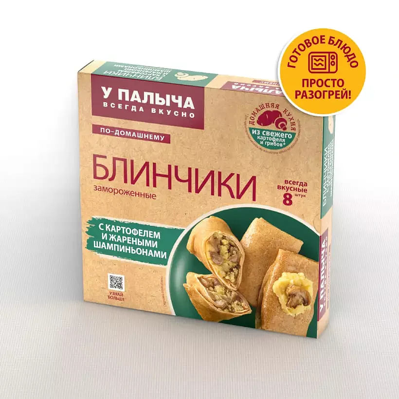 Тончайшие блинчики на молоке, из муки высшего сорта и свежих яиц, смазанные сливочным маслом. Начинка готовится на самом производстве из свежих овощей и отборных шампиньонов. Картофельные клубни чистятся и отвариваются до готовности. Лук и шампиньоны шинкуются кубиком 1см*1см и обжариваются на растительном подсолнечном масле. Протертый картофель тщательно перемешивается с обжаренными грибочками. К готовой начинке добавляем только немного соли и черного молотого перца. Тонкий блинчик и сытная начинка не оставят вас равнодушным. Продукт является замороженным готовым блюдом. Вам останется только достать из упаковки и разогреть любым доступным способом: в микроволновой печи, на сковороде или в духовом шкафу. Блинчики с картофелем и жареными шампиньонами ТМ «У Палыча» — натуральный продукт ручной работы, приготовленный по домашним рецептам, не оставит равнодушным ваших родных и близких.