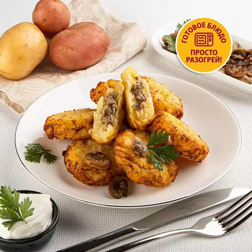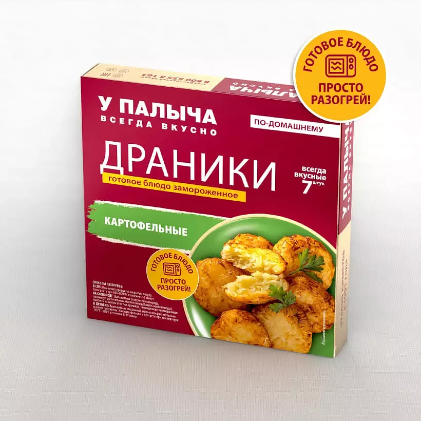 Драники картофельные с грибами ТМ «У Палыча» это сытное блюдо! Хрустящая корочка драников в сочетании с нежной грибной начинкой и сыром создаёт гармоничное сочетание текстур и вкусов. Обжаренные отборные шампиньоны с сыром собственного производства придают дополнительную насыщенность. Это блюдо отлично подойдёт как для обеда, так и для ужина, а также может стать хорошей закуской. Продукт является замороженным готовым блюдом. Вам останется только достать из упаковки и разогреть любым доступным способом: в микроволновой печи, на сковороде или в духовом шкафу. Драники картофельные с грибами станут любимым вариантом для вашего обеда или ужина, который непременно понравится всем членам семьи! Энергетическая ценность /калорийность: 205 ккал/859 кДж.