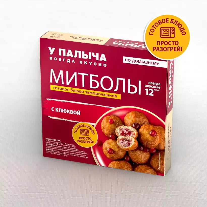 Митболы с клюквой ТМ «У Палыча» имеют насыщенный и сочный вкус благодаря сочетанию свинины и курицы. Клюквенная начинка придает блюду легкую кислинку и сладость, что создает интересный контраст с мясным вкусом. Мы сами готовим начинку на производстве из натуральной клюквы. Митболы с клюквой ароматные и приятные на вкус. Попробуйте их с любимым гарниром и они станут вашим любимым блюдом! Продукт является замороженным готовым блюдом. Вам останется только достать из упаковки и разогреть любым доступным способом: в микроволновой печи, на сковороде или в духовом шкафу. Митболы станут любимым вариантом для вашего обеда или ужина, который непременно понравится всем членам семьи! Энергетическая ценность /калорийность: 356 ккал/1491 кДж