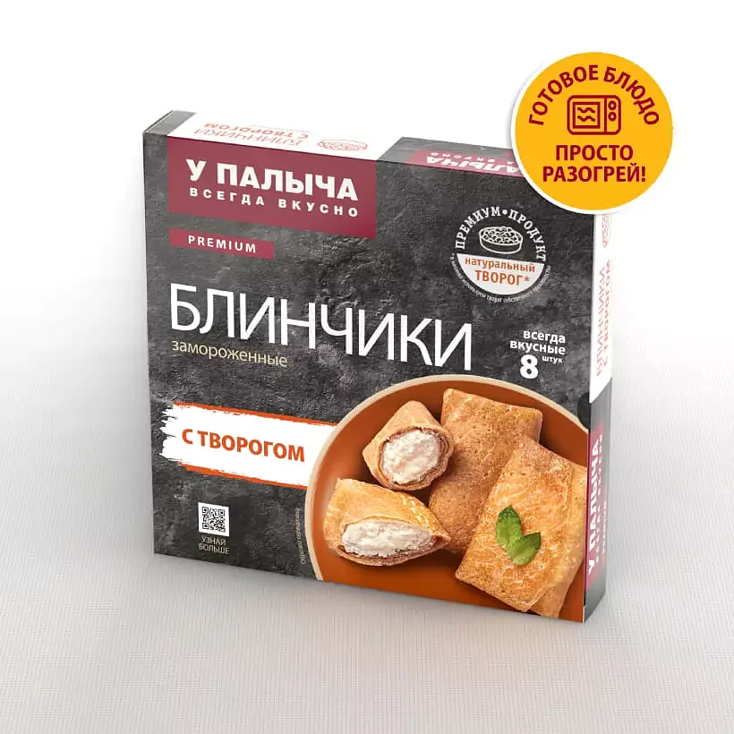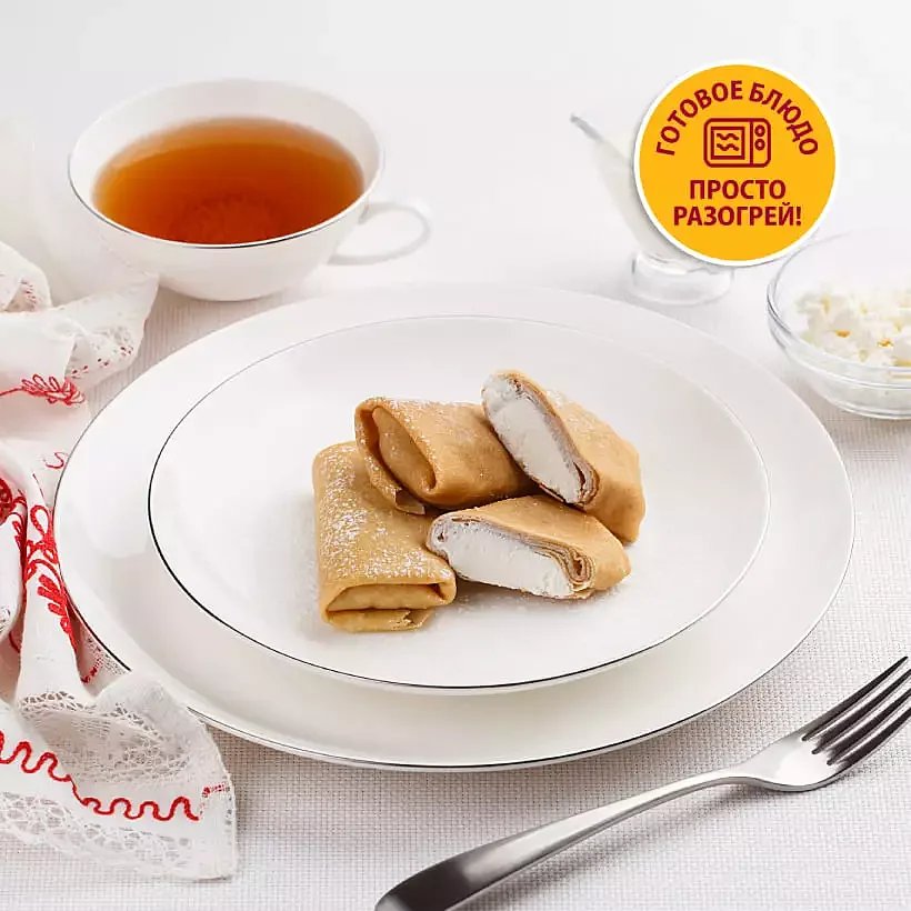 Замороженное готовое блюдо! Нежные тонкие блинчики. Натуральный деревенский творог со сметанкой, ванилином и сахаром.