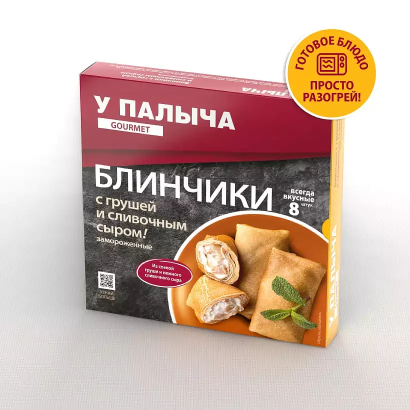 Gourmet — эксклюзивная серия блюд ресторанного уровня от ТМ «У Палыча». Через призму высокой гастрономии наш бренд-шеф познакомит Вас с богатством вкуса натуральных ингредиентов и необычных сочетаний. Истинные гурманы оценят! Тончайшие блинчики на молоке, из муки высшего сорта и свежих яиц, смазанные сливочным маслом. Сами готовим начинку из сладкой груши и нежного сливочного сыра собственного производства. Тонкий блинчик и сладкая начинка с утонченным вкусом не оставят вас равнодушным. Продукт является замороженным готовым блюдом. Хозяйке остается только достать из упаковки и разогреть любым доступным способом: в микроволновой печи, на сковороде или в духовом шкафу. Блинчики с грушей и сливочным сыром ТМ «У Палыча» — идеальный завтрак или легкий десерт ресторанного уровня, который порадует вкусом вас и ваших близких.