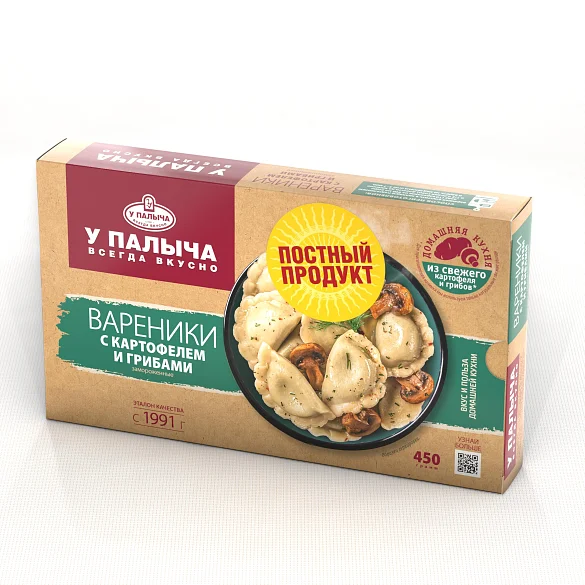 Начинка: картофель, грибы шампиньоны, лук репчатый, масло растительное подсолнечное, соль поваренная пищевая, перец черный молотый. Тесто: мука пшеничная хлебопекарная высшего сорта, вода питьевая, соль поваренная пищевая.