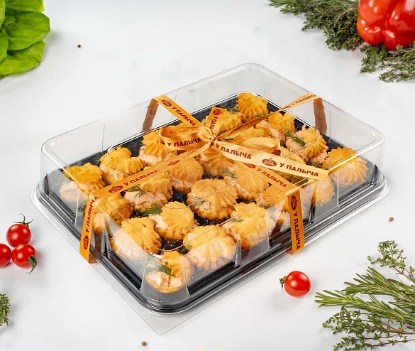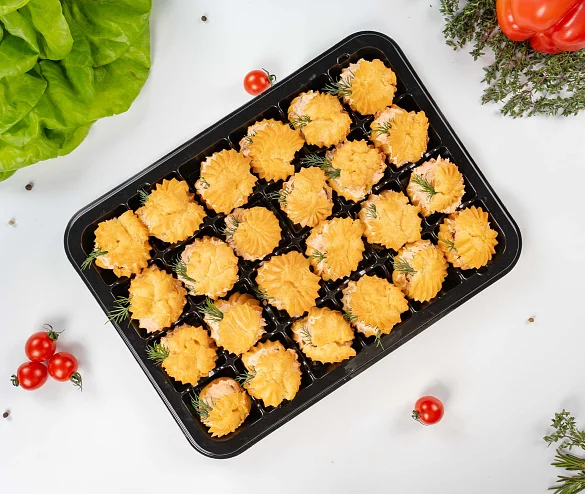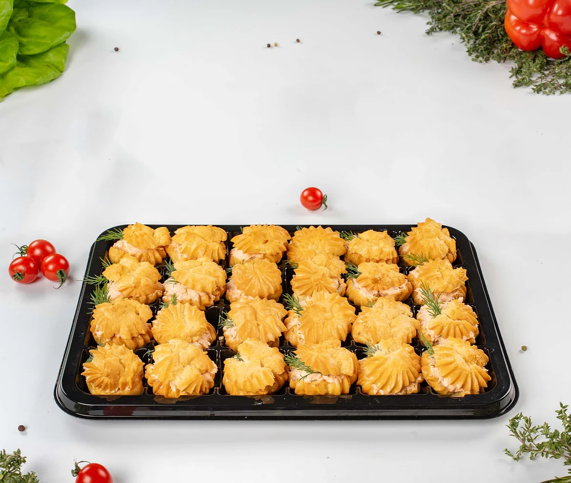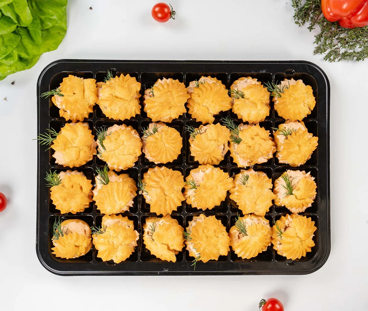 Изысканная французская закуска из легкого заварного теста в сочетании с нежной начинкой из свежего творожного сыра собственного изготовления и нежнейшей слабосоленой форели. Без заменителей молочных жиров. Идеально для праздничного стола дома или на работе. Без глютена. 24 шт х 20 г.