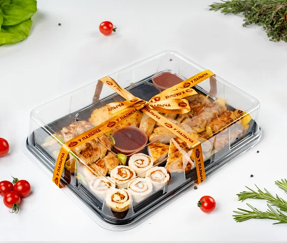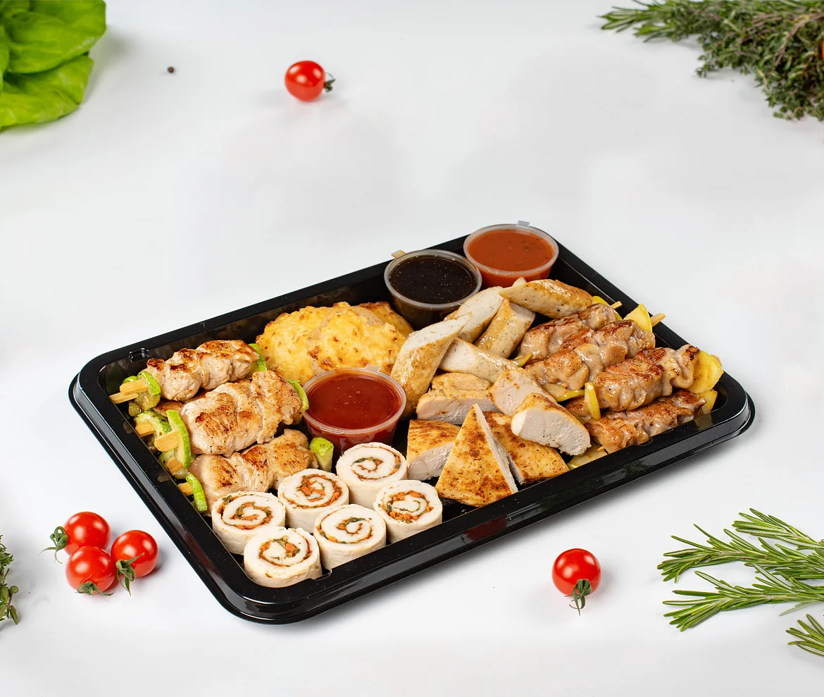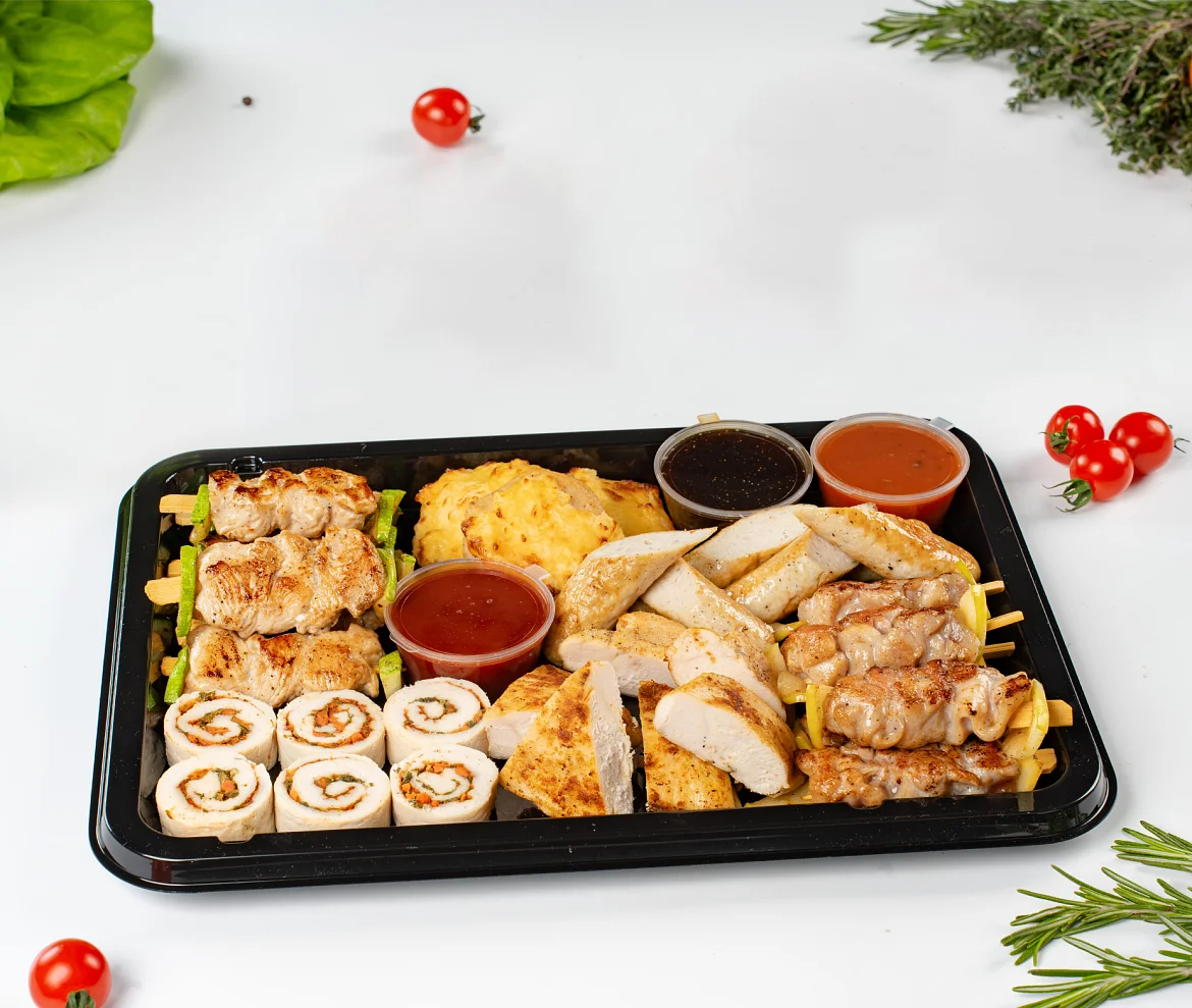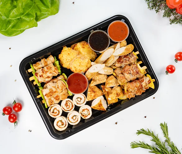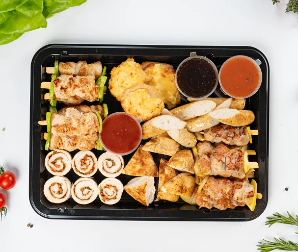 Идеальное решение для фуршета на работе или для домашнего праздника. Ассорти блюд из курицы и индейки. В наборе: Куриная грудка гриль, колбаски куриные гриль, шашлычки куриные, рулет из курицы, курица с ананасом, шашлычки из индейки. В наборе : куриная грудка гриль - 180 г, рулет из курицы - 180 г, колбаски куриные гриль - 150 г, курица с ананасом - 150 г, шашлычки куриные - 120 г, шашлычки из индейки - 120 г, соус Терияки - 50 г, соус кисло-сладкий - 50 г, соус шашлычный - 50 г. ***Мы заботимся о Вас и Ваших гостях — к платтеру прилагается набор из 10 экологичных и безопасных вилок из биоразлагаемого кукурузного крахмала.