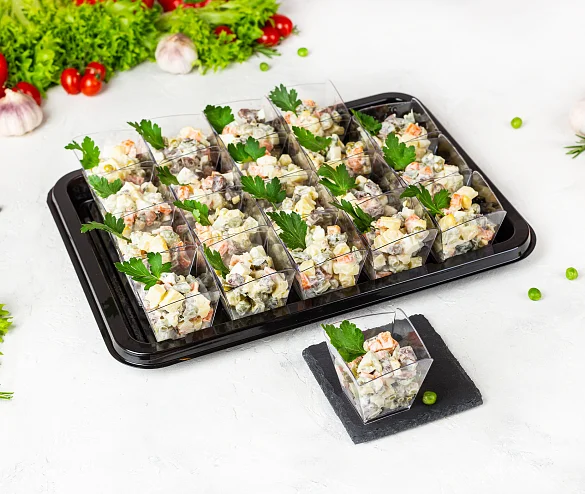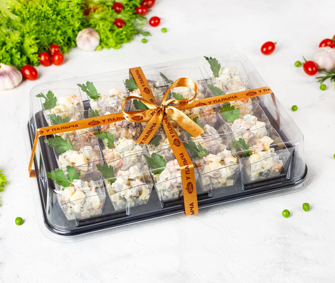 Любимый традиционный салат из овощей, горошка и вареной говядины. Заправлен вкуснейшим майонезом собственного производства исключительно из натуральных ингредиентов. ***Мы заботимся о Вас и Ваших гостях — к платтеру прилагается набор из 10 экологичных и безопасных вилок из биоразлагаемого кукурузного крахмала.
