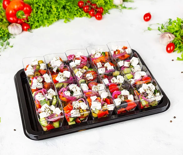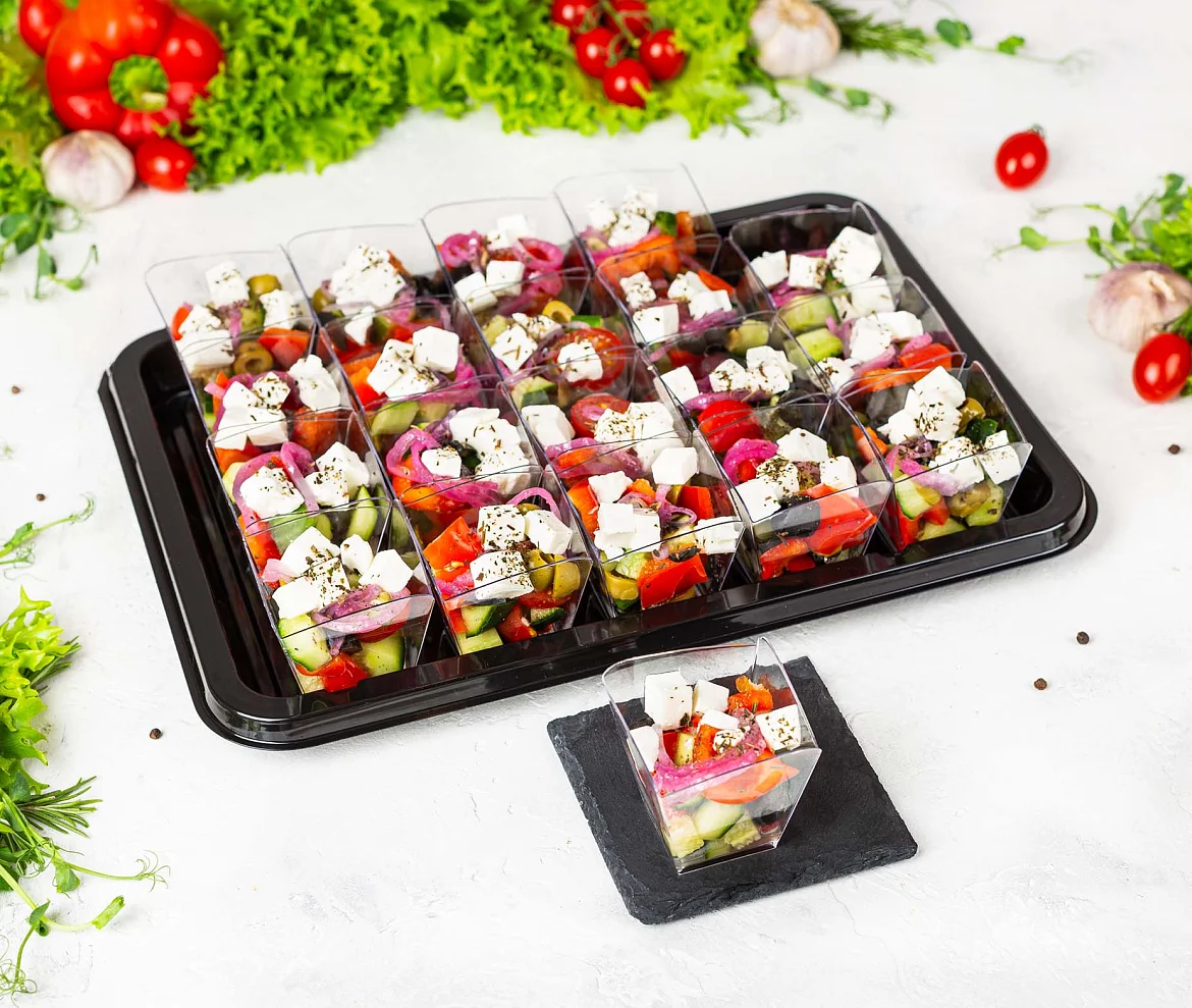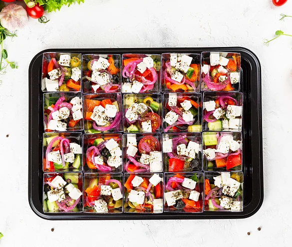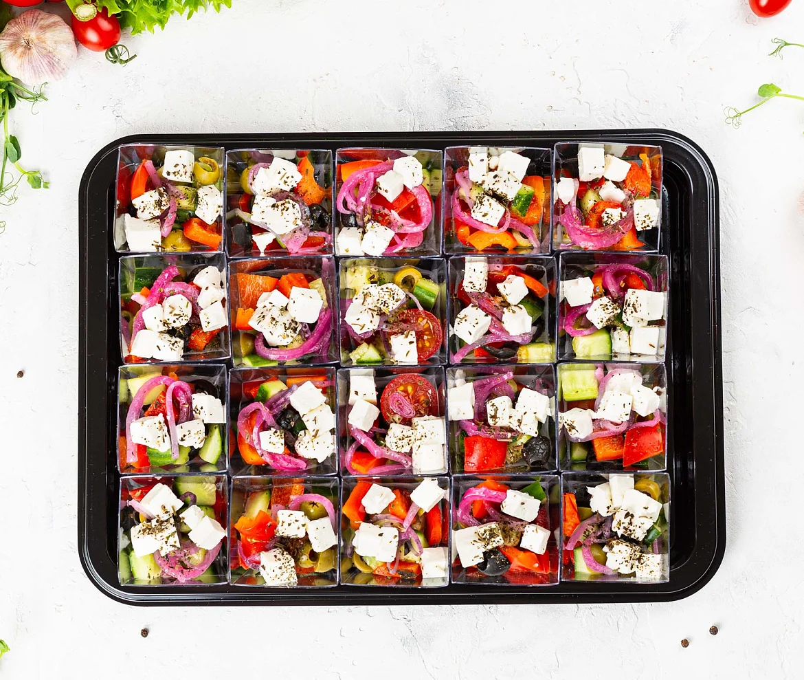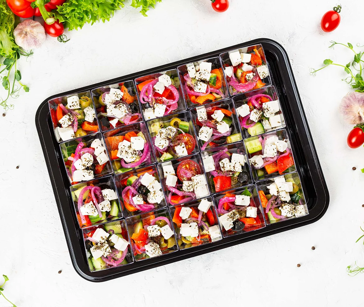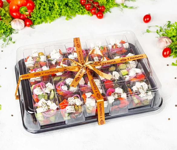 Классика мировой кухни. Свежие овощи, нежный творожный сыр, вкусные маслины и ароматное оливоковое масло. Украшение для любого праздника. ***Мы заботимся о Вас и Ваших гостях — к платтеру прилагается набор из 10 экологичных и безопасных вилок из биоразлагаемого кукурузного крахмала.