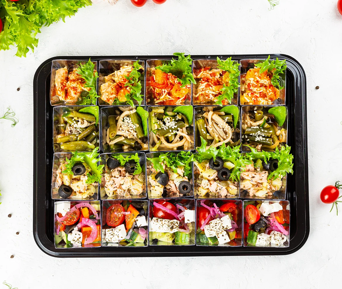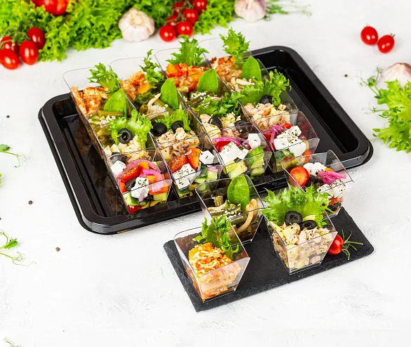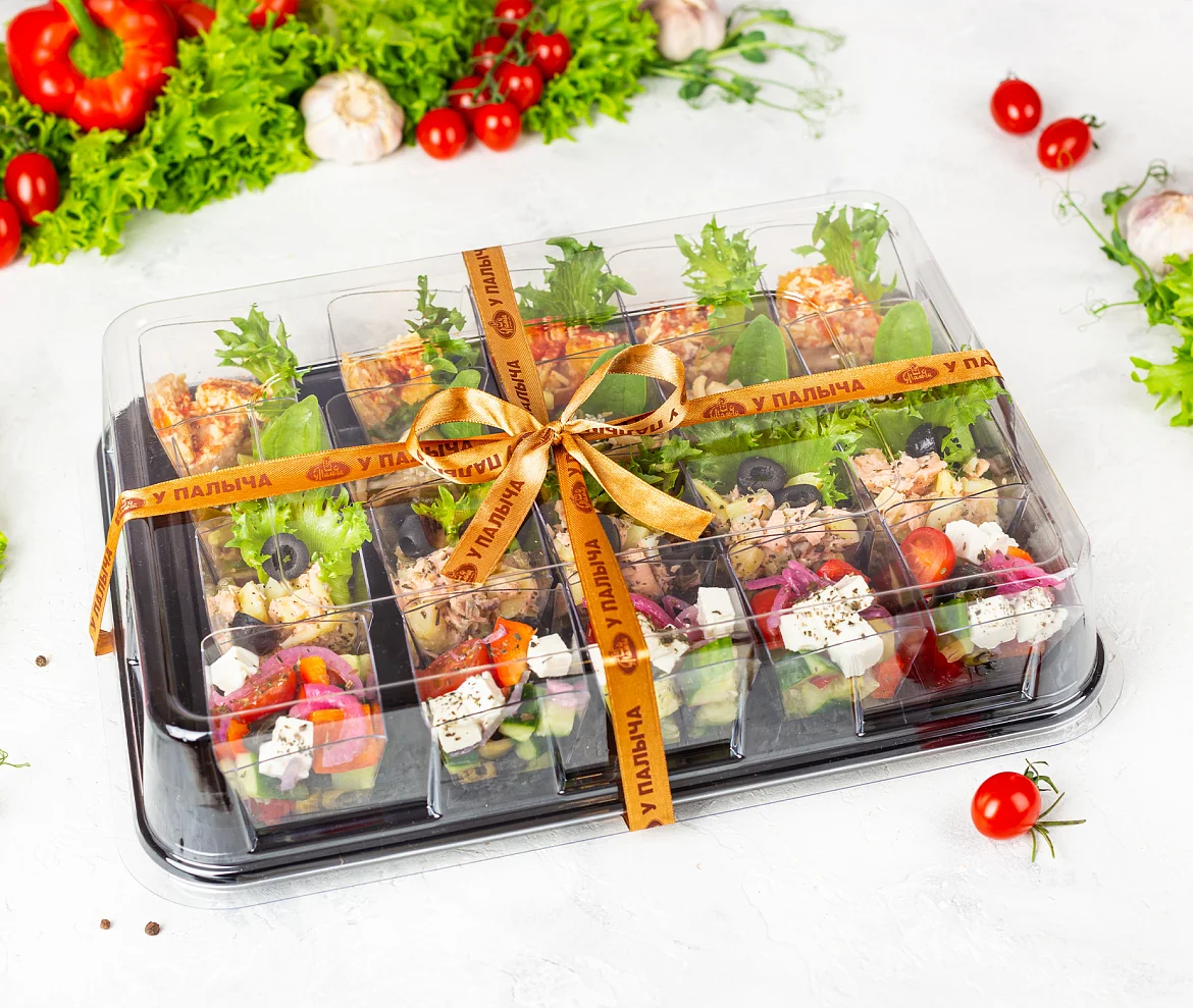 Сет Салатов Средиземноморский 4 вида по 5 штук (Салат Греческий, Салат Итальянский с горбушей и картофелем, Салат с кальмарами, фасолью и соусом терияки, Салат с куриной грудкой и апельсинами) 800 г