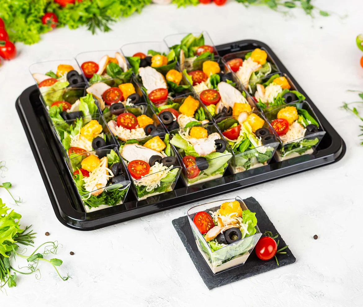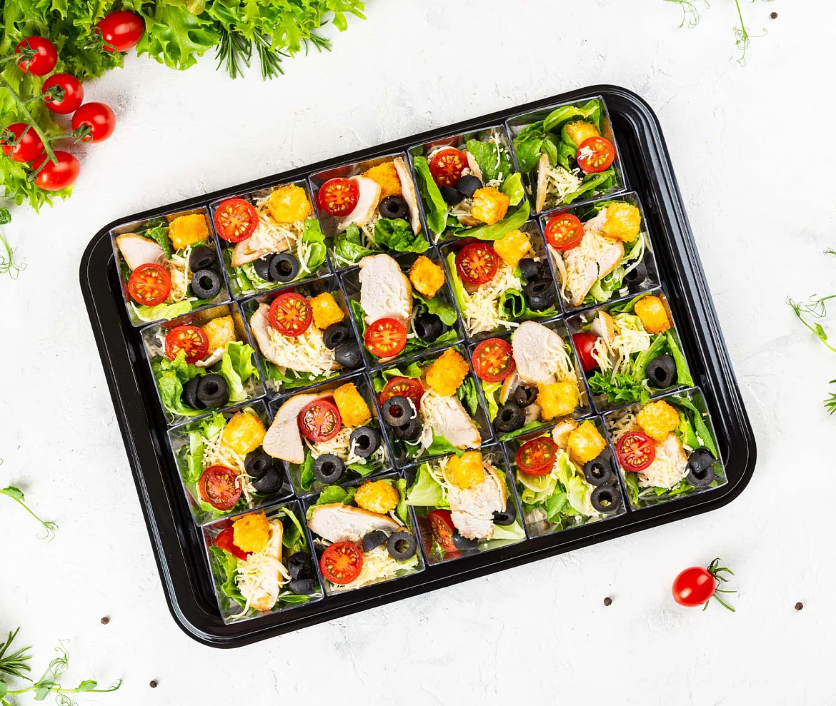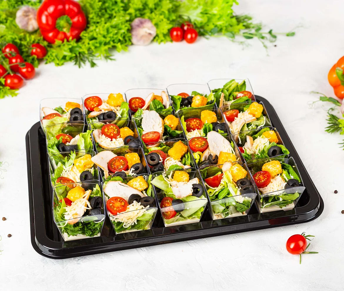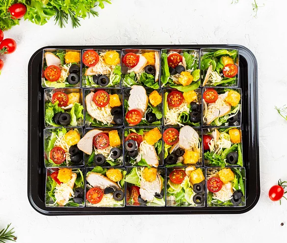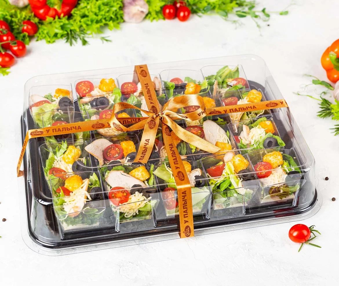 Знаменитое блюдо из свежего салата Романо с аппетитными слайсами нежного куриного филе, ароматным сыром “Пармезан”, спелыми томатами, хрустящими пшеничными гренками и фирменной заправкой “Цезарь” с добавлением легендарного соуса “Вотчестер”. ***Мы заботимся о Вас и Ваших гостях — к платтеру прилагается набор из 10 экологичных и безопасных вилок из биоразлагаемого кукурузного крахмала.