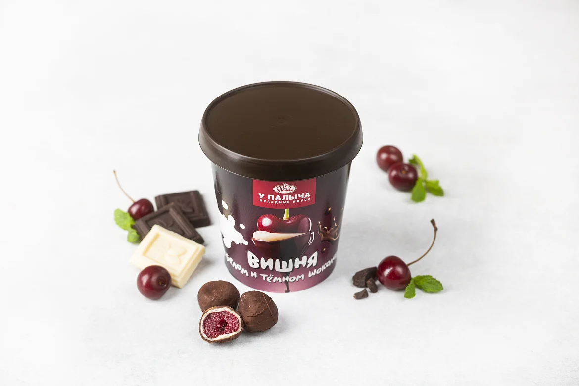 Вишня свежемороженая (38%), шоколад белый (33%) (сахар, масло какао, молоко цельное сухое, сыворотка молочная сухая, эмульгатор соевый лецитин, ароматизатор экстракт ванили натуральный), шоколад темный (29%) (какао тёртое, сахар, масло какао, эмульгатор соевый лецитин, ароматизатор экстракт ванили натуральный) Произведено на предприятии, на котором также выпускаются продукты, содержащие арахис, кунжут, молоко, орехи.