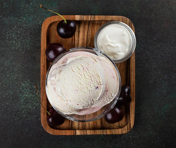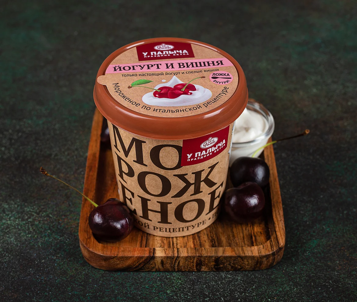 Молоко питьевое, сахар, масло сливочное (сливки пастеризованные), вода очищенная, сухое обезжиренное молоко, стабилизаторы (моно- и диглицериды жирных кислот, камедь рожкового дерева, гуаровая камедь, каррагинан), йогуртовый порошок (молоко сухое обезжиренное, закваска), глюкоза, сыворотка молочная сухая, вишня с/м, регулятор кислотности лимонная кислота, ароматизаторы, агент желирующий пектины, консервант сорбат калия. Произведено на предприятии, на котором также выпускаются продукты, содержащие орехи, глютен, соевый лецитин.