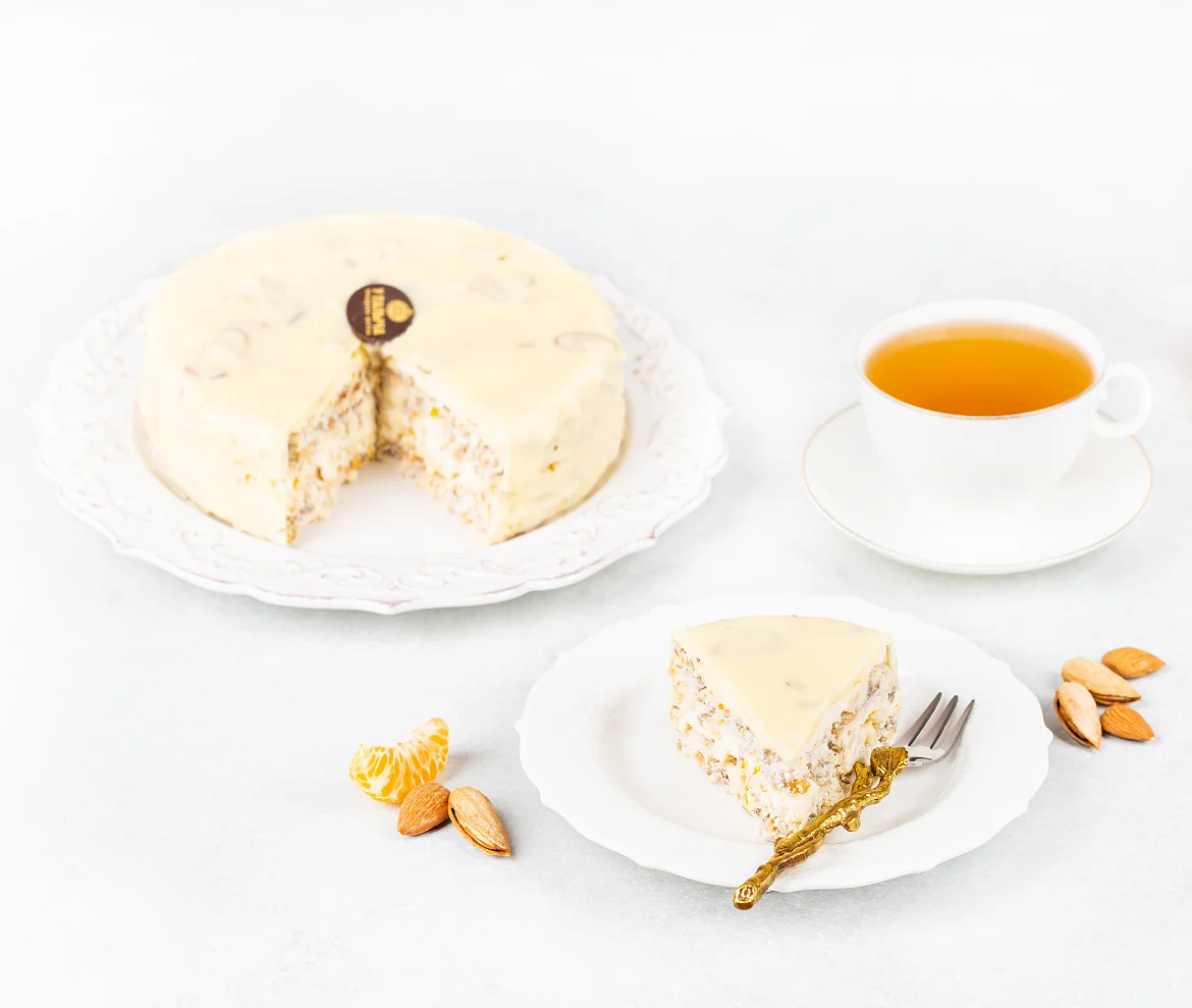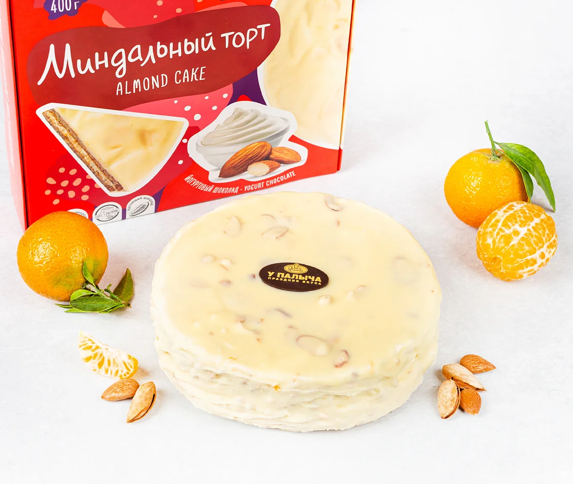 Авторский миндальный торт с ореховыми коржами, заварным кремом с настоящей цельной сгущенкой из натурального молока и сочной начинкой из спелых мандаринов, нежным йогуртовым шоколадом от профессиональных шоколатье У Палыча и лепестками миндаля, укрытыми аппетитным шоколадным слоем по всей поверхности торта. Лакомство без пшеничной муки, для истинного наслаждения без границ.