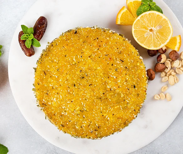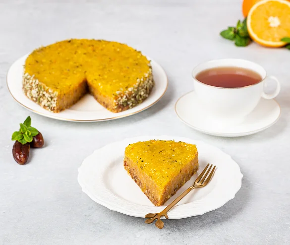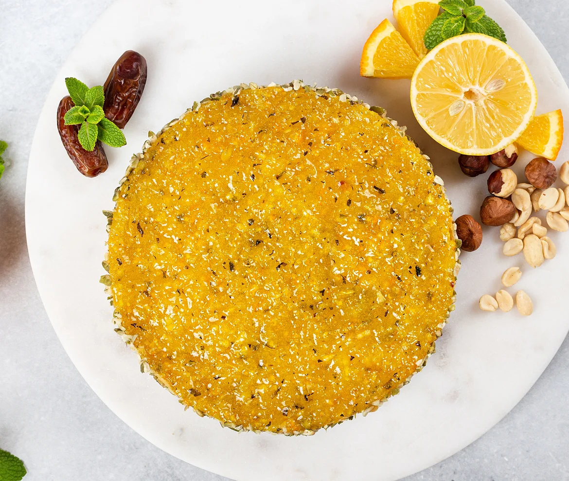 Великолепное сочетание оригинального мусса из фундука, арахиса и кураги с конфитюром из спелых лимонов, апельсинов и свежей мяты и с тонким коржом из фиников и арахиса, с добавлением розовой гималайской соли и сладкого сиропа из натурального топинамбура. Полезное и очень вкусное безглютеновое лакомство без сахара, муки и продуктов животного происхождения. Идеально для веганов, сыроедов, ценителей современных трендов и приверженцев здорового образа жизни.