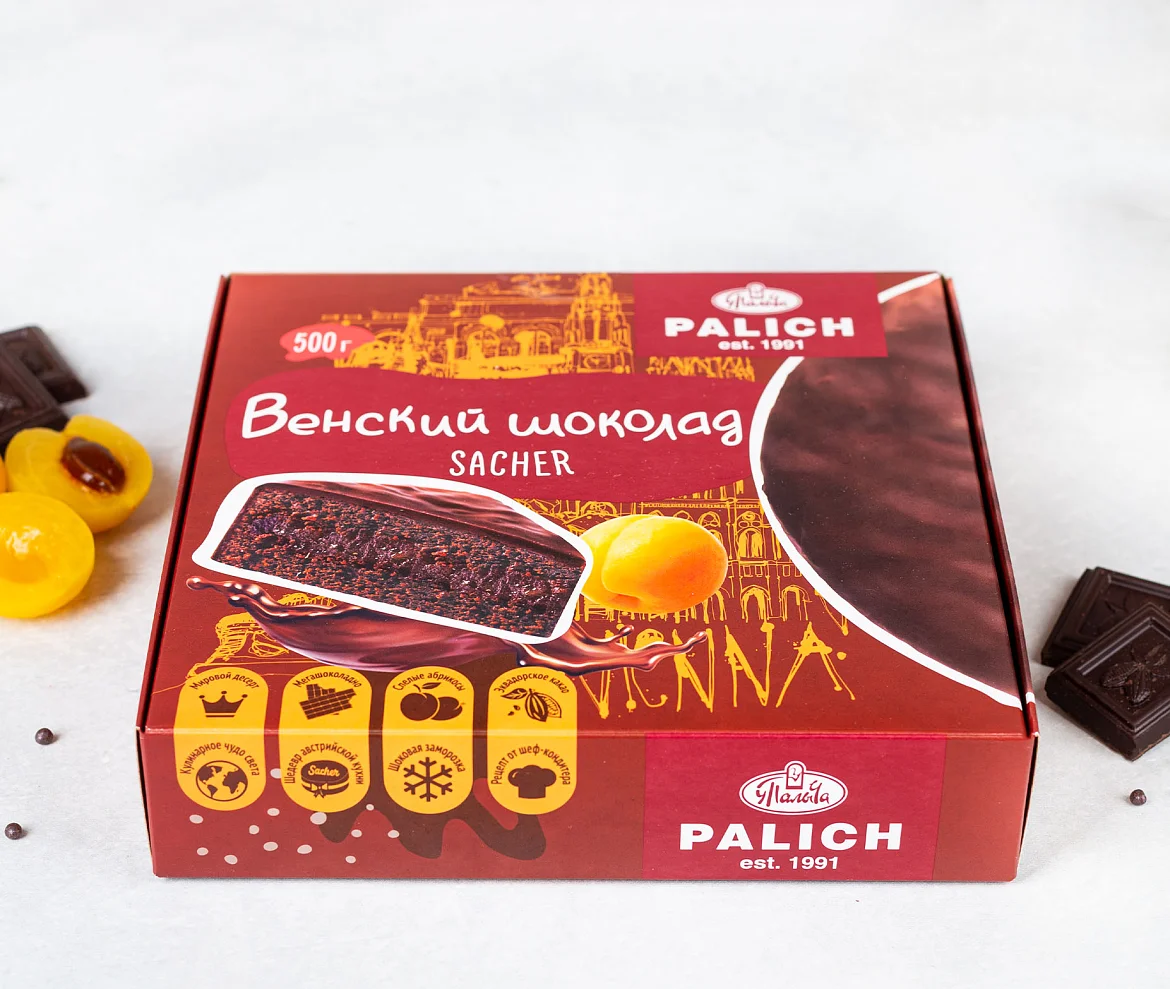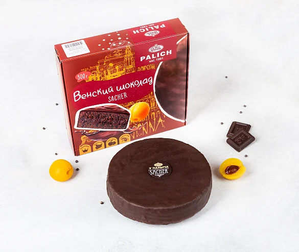Австрийский десерт №1, известный во всем мире - торт Sacher. Кондитеры У Палыча предложили свою оригинальную версию, которая идеально передает вкус классического, известного с 19 века, торта. Шоколадные коржи с премиальным эквадорским какао, ароматный конфитюр из спелых абрикосов и щедрый слой темного шоколада из отборных какао-продуктов без заменителей - этот торт истинный аристократ мира тортов!