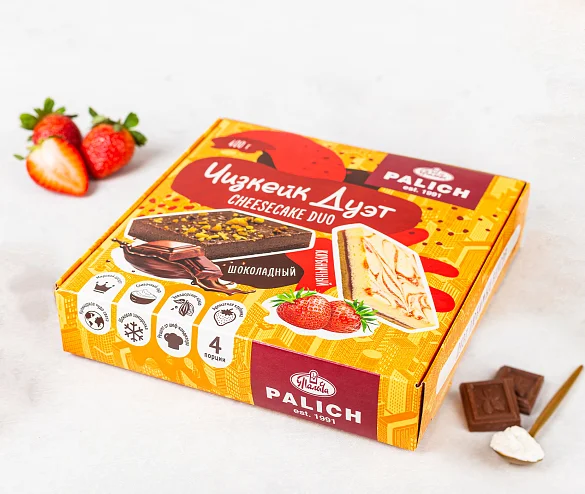 Мировая классика - выпечной чизкейк из нежного творожно-сливочного сыра в оригинальном исполнении от шеф-кондитера У Палыча. Дуэт из двух самых популярных вкусов: сливочный чизкейк с клубничной начинкой из натуральной клубники и шоколадный с настоящим темным шоколадом из отборных какао-продуктов и эквадорским какао. В наборе 4 идеально ровных кусочка: 2 клубничных и 2 шоколадных. Можно порадовать всю семью, а можно размораживать по кусочку и баловать себя этим нежным сливочным лакомством.