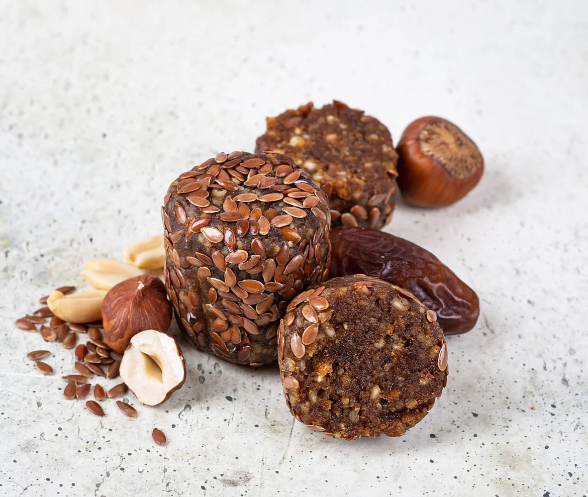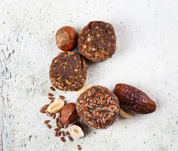 Финики, ядра орехов фундука, вода очищенная, крупа гречневая зеленая, семена кунжута, кокосовая стружка, ядра арахиса, какао-порошок, соль гималайская розовая, изолят (концентрат) горохового белка, антиокислитель экстракт розмарина, семена льна, регулятор кислотности лимонная кислота. Произведено на предприятии, на котором также выпускаются продукты, содержащие глютен, молоко, сою, яйца.