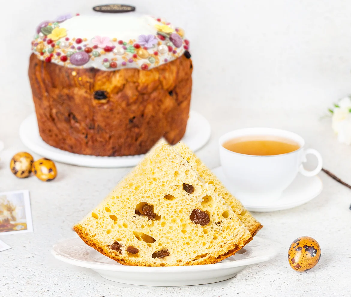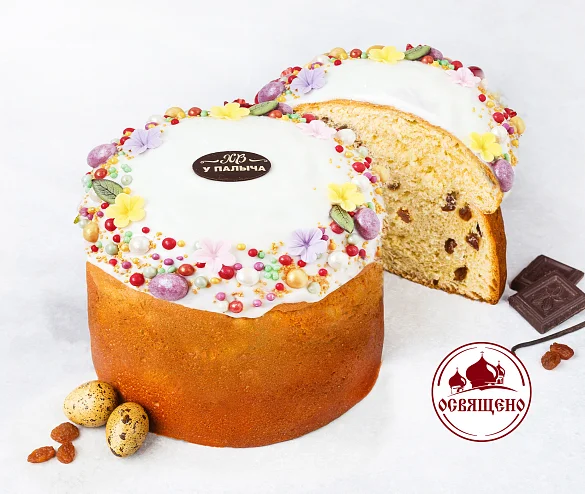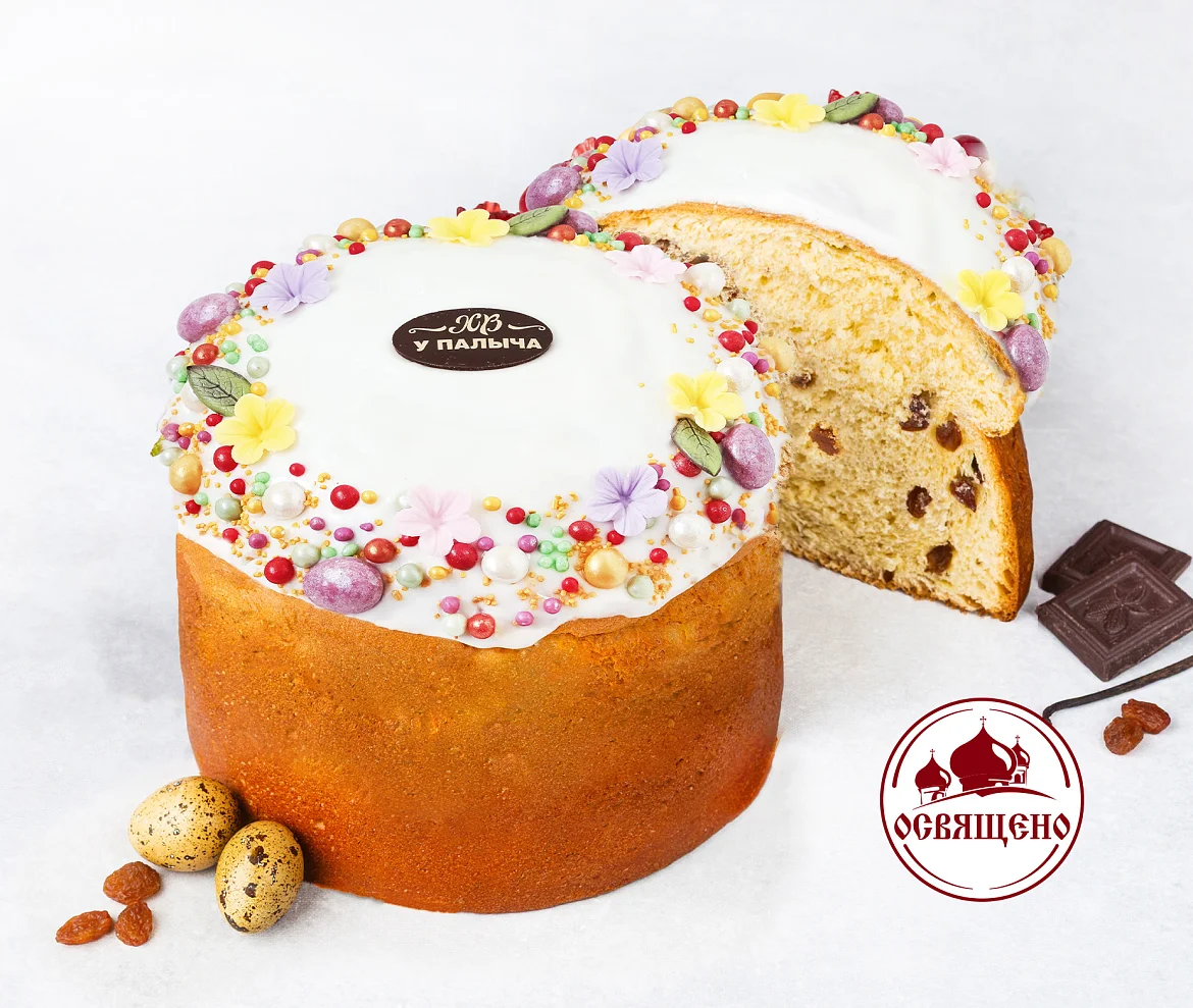 С заботой о вас вся пасхальная выпечка уже освящена. ***Этот великолепный кулич — не просто сладкое угощение, а настоящая кулинарная симфония, объединяющая традиции и современность. Кулич обладает нежной и воздушной текстурой благодаря тщательно подобранным ингредиентам. Основу составляют высококачественная пшеничная мука и свежие яйца, что придаёт ему лёгкость и насыщенный вкус. И много вкуснейшего отборного изюма – как в традиционном куличе по домашнему рецепту. Сверху легендарная помадка от Палыча и роскошный праздничный декор.