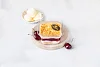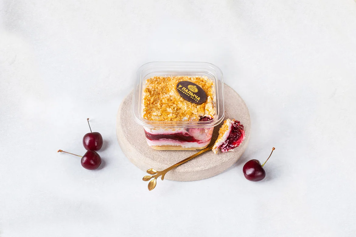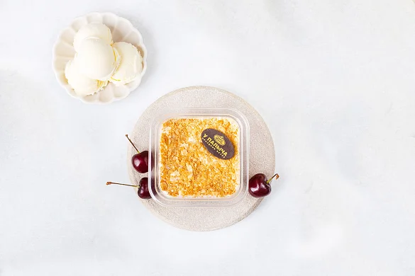 Хрустящее слоёное тесто с нежным кремом из кокосовых сливок, натурального сгущённого молока и вкуснейшего сливочного мороженого. Начинка из сладкой сербской вишни добавляет легкую кислинку и яркость вкусу. Идеально для наслаждения в удобном стаканчике!