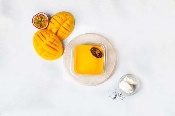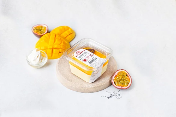 Сахар, вода очищенная, сыр творожный (творог, вода питьевая, сливки из коровьего молока, соль йодированная, комплексная пищевая добавка (смесь сывороточных белков, стабилизаторы: каррагинан, камедь рожкового дерева)), кокосовые сливки (вода очищенная, масло кокосовое рафинированное дезодорированное, сахар, желирующий агент каррагинан), сметана (сливки, закваска), яйцо куриное пищевое, сливки питьевые с массовой долей жира 33%, манго с/м, мука пшеничная в/с, мак пищевой, шоколад темный (какао тёртое, сахар, масло какао, эмульгатор соевый лецитин, ароматизатор экстракт ванили натуральный), пюре из плодов маракуйи, желирующий агент желатин, патока, какао тёртое, крахмал кукурузный, глюкоза ферментированная, регулятор кислотности лимонная кислота, ароматизаторы, соль, стабилизатор карбонат кальция, красители: куркумин, кармины, оксиды железа. Произведено на предприятии, на котором также выпускаются продукты, содержащие арахис, кунжут, орехи.