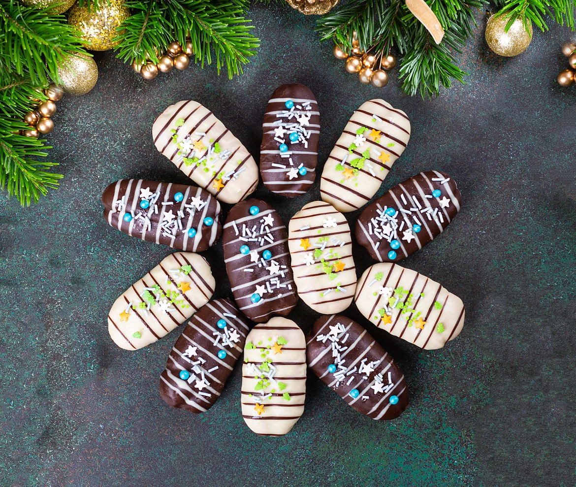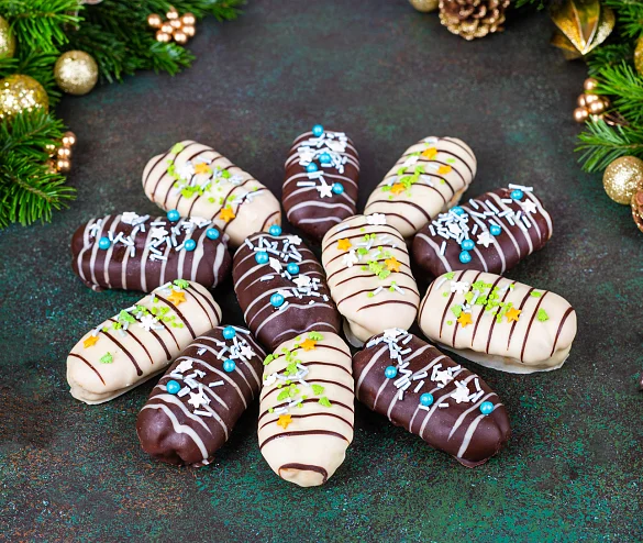 Поздравительная надпись на пирожном может отличаться, но обязательно будет праздничной. Нежные заварные пирожные со сливочным и шоколадно-сливочным кремом. Пирожные со сливочным кремом покрываются горьким шоколадом, а с шоколадно-сливочным кремом – белым шоколадом. В качестве праздничного новогоднего декора – разноцветные конфетти.