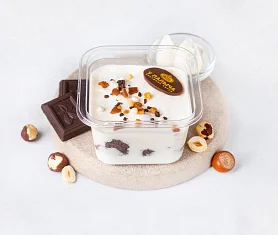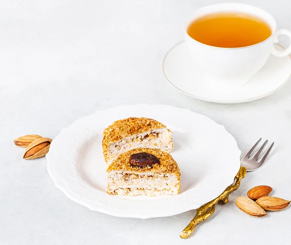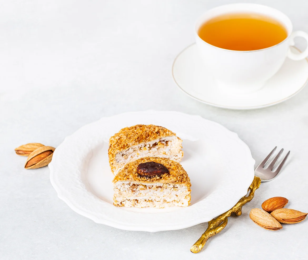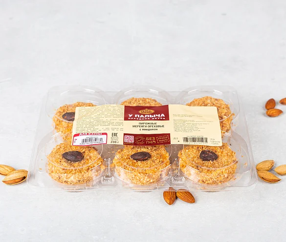 Два слоя воздушного безе с изобилием дробленого ореха миндаль, соединённых нежным сливочно-заварным кремом, воздушной меренге и дробленого грильяжа. Украшает пирожное миндаль в горьком шоколаде.