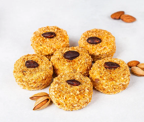 Сахар, яйцо куриное пищевое, ядра миндаля, масло сливочное (13%) (сливки пастеризованные), ядра орехов фундука, ядра арахиса, лимоны свежие, мука рисовая, шоколад темный (какао тёртое, сахар, масло какао, эмульгатор соевый лецитин, ароматизатор экстракт ванили натуральный), вода очищенная, масло подсолнечное рафинированное дезодорированное, регулятор кислотности лимонная кислота, консервант сорбиновая кислота, ароматизатор экстракт ванили натуральный. Произведено на предприятии, на котором также выпускаются продукты, содержащие кунжут. ПРИ ПРОИЗВОДСТВЕ ИСПОЛЬЗУЮТСЯ ОРЕХИ, КОТОРЫЕ ПРОШЛИ ТЩАТЕЛЬНУЮ ОБРАБОТКУ, ОДНАКО, В РЕДКИХ СЛУЧАЯХ НЕ ИСКЛЮЧЕНО ПОПАДАНИЕ СКОРЛУПЫ И (ИЛИ) ЕЁ ФРАГМЕНТОВ.