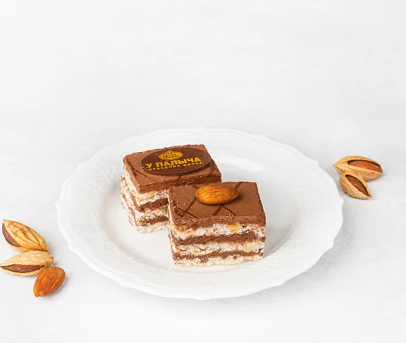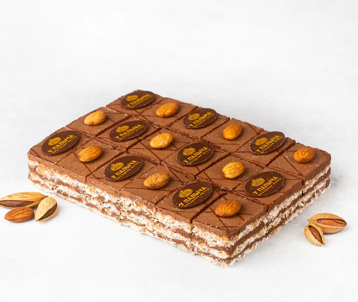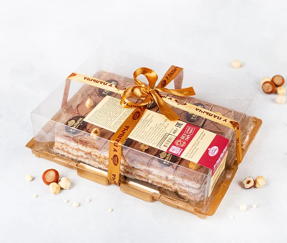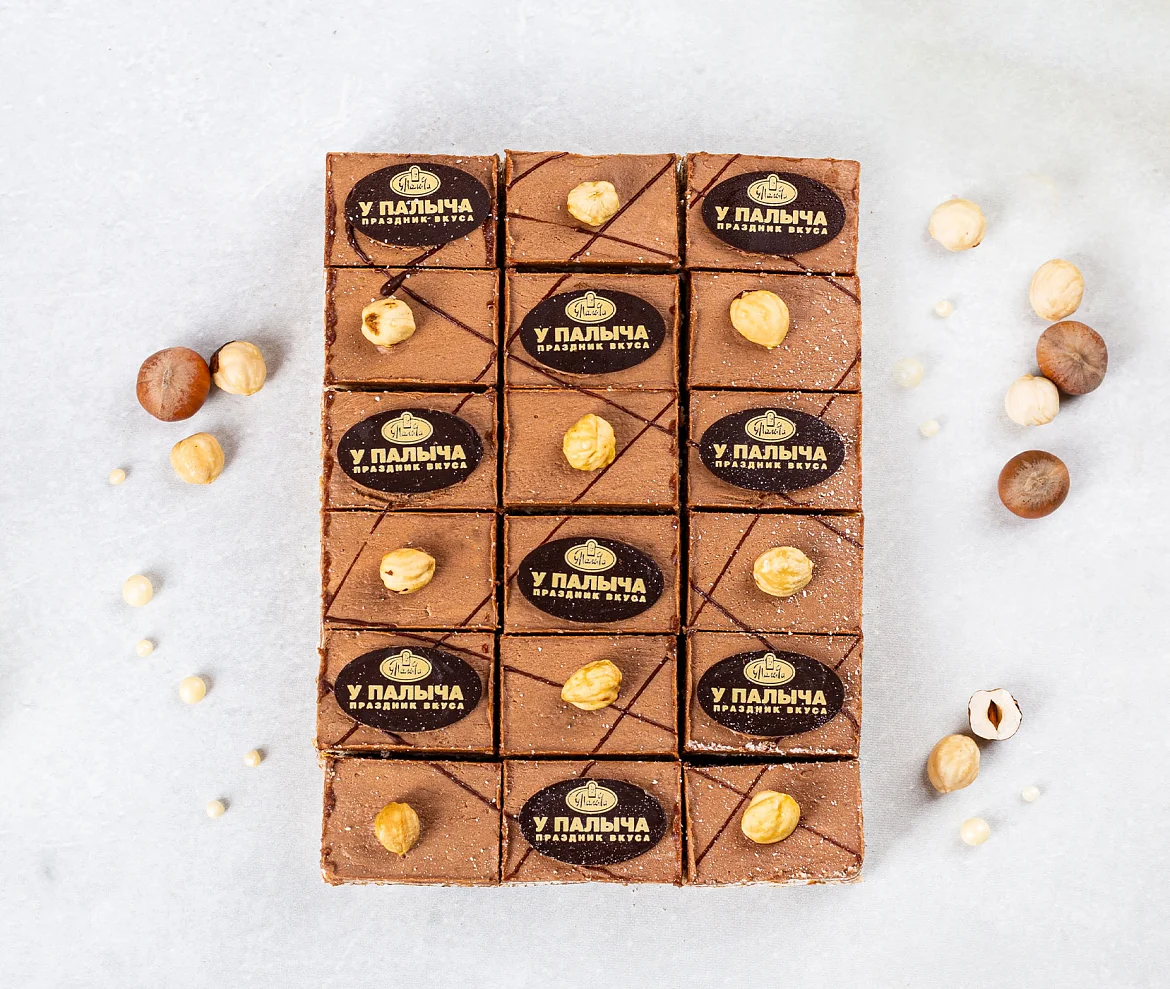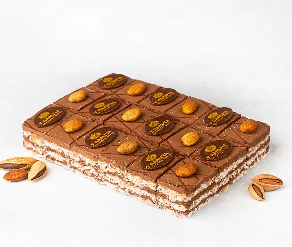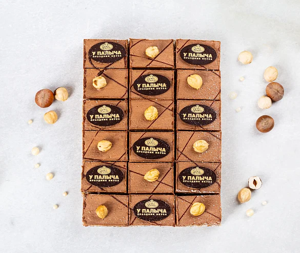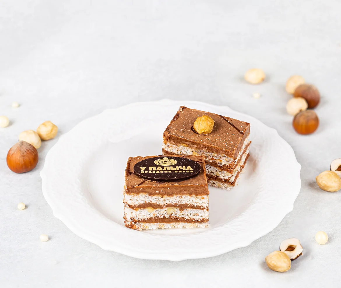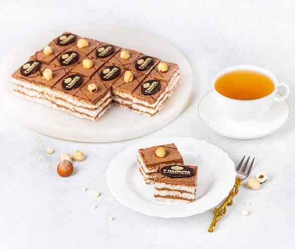 Лесные орехи, фундук, воздушно-ореховые коржи и шоколадный крем «Шарлотт», настоящий горький шоколад – только свежие натуральные ингредиенты.