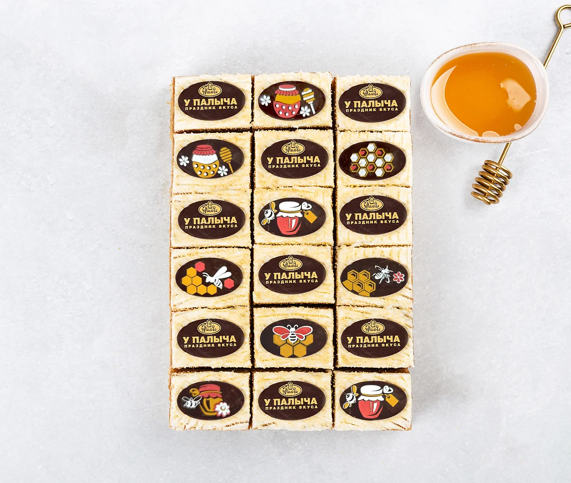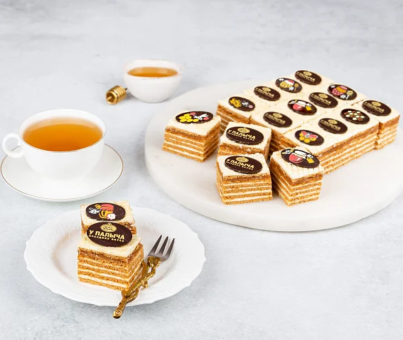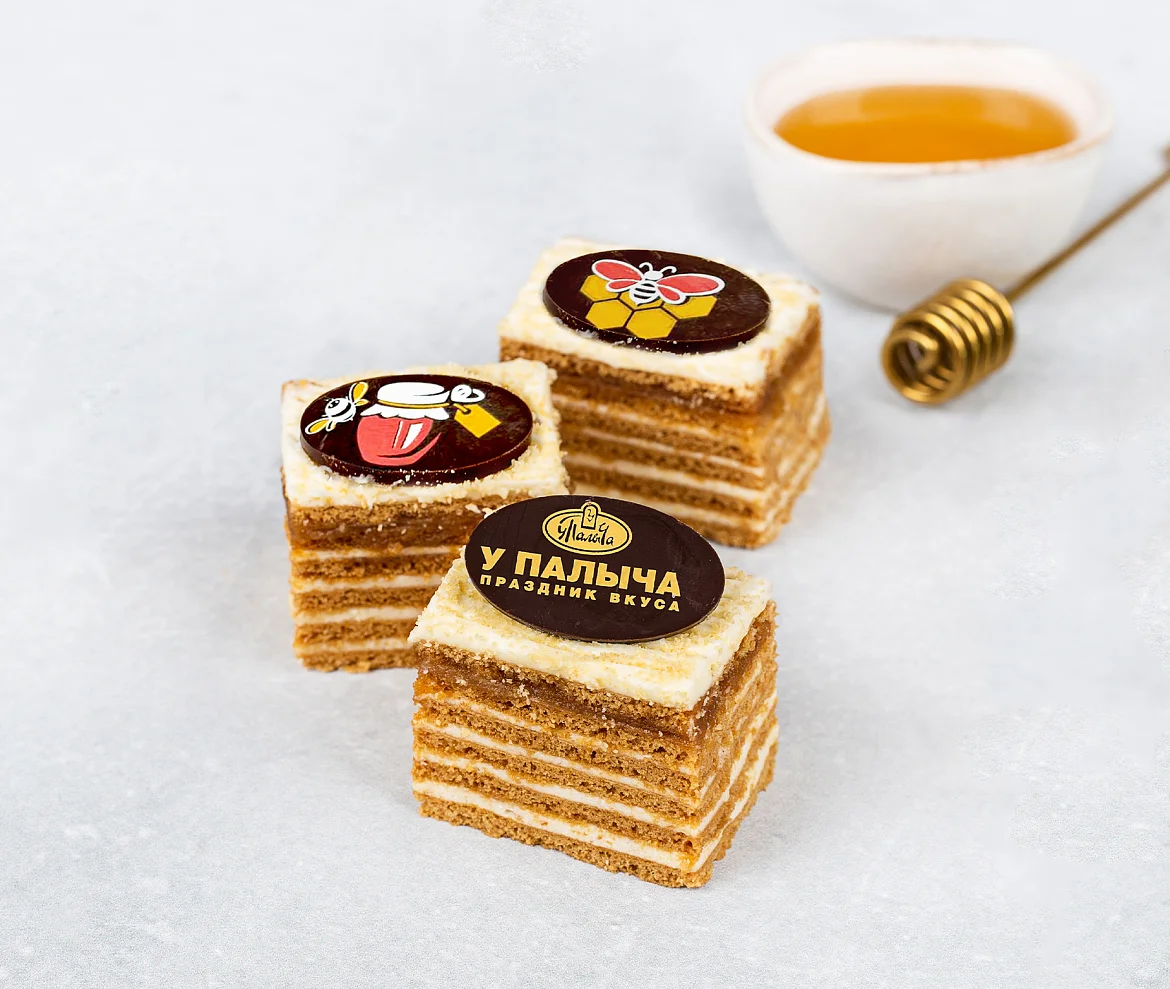 Натуральный цветочный мед, сливочно-заварной крем и тончайшие медовые коржи порадуют любителей медовых десертов. Изысканное лакомство в новой стильной подаче – пирожные-канапе, украшенный медальками из темного шоколада.
